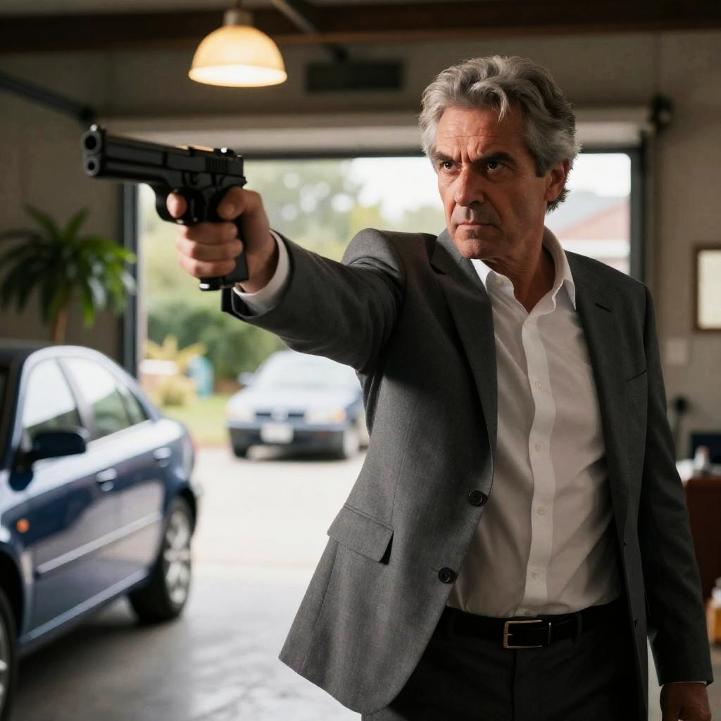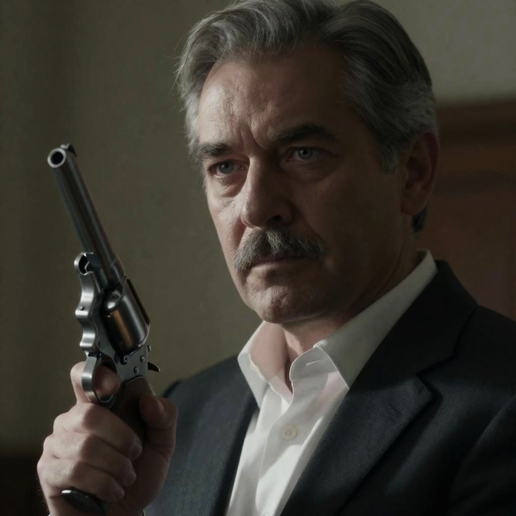 Middle-aged man with gray hair and mustache, wearing brown suit and blue tie, firing black handgun with bright muzzle flash. Background has vertical white and gray stripes. Intense facial expression. Photograph.