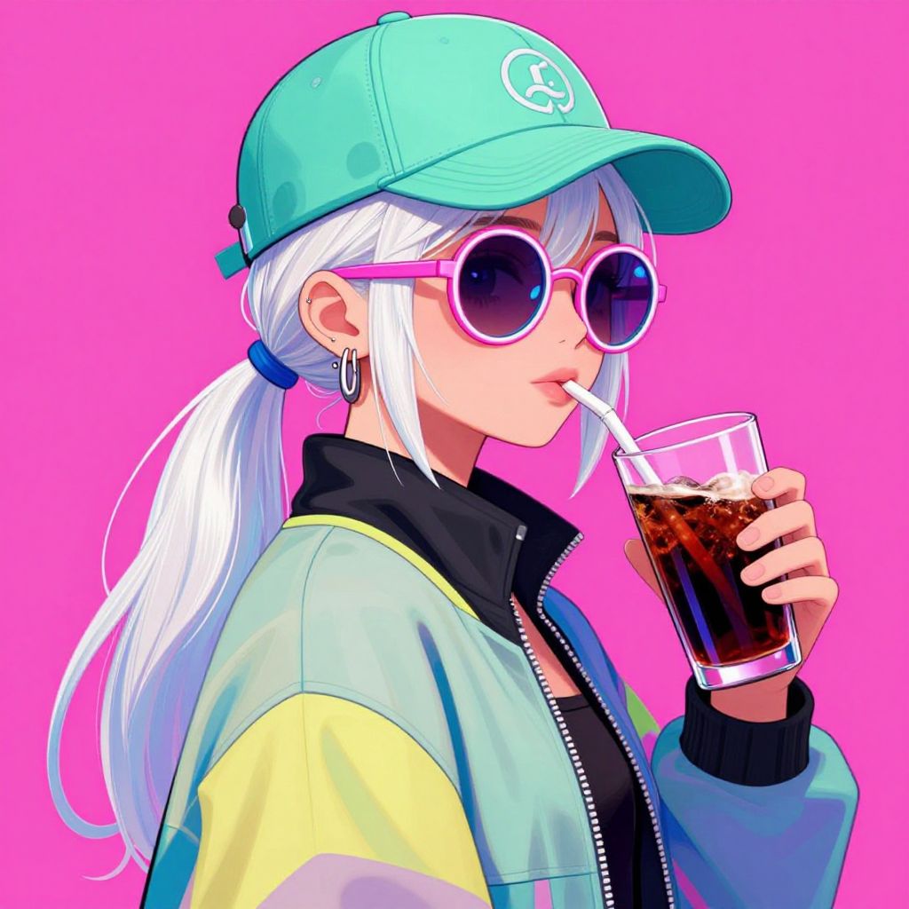 A stylish young woman depicted in vibrant, pop art-inspired illustration, set against a bold, hot pink background, She wears a light green baseball cap with an embroidered emblem, her long, icy white hair tied into a sleek low ponytail that cascades gracefully down her back, Her neon-accented, round sunglasses reflect the ambient light, adding a futuristic edge to her casual look, She sips from a glass of dark soda through a straw, her lips subtly curled in a relaxed expression, Her outfit consists of a loose, high-collared jacket, giving off a laid-back, streetwear vibe, Multiple earrings adorn her ears, including hoops and studs, and there are several small piercings along the upper cartilage, showcasing her edgy, fashion-forward personality, The overall color palette is bright and dynamic, with shades of turquoise, black, and pastel tones popping against the vivid background, creating an eye-catching and modern aesthetic, top quality, official art, beautiful and aesthetic, 1girl, colorful, highest detailed, highly detailed CG illustration, an extremely delicate and beautiful