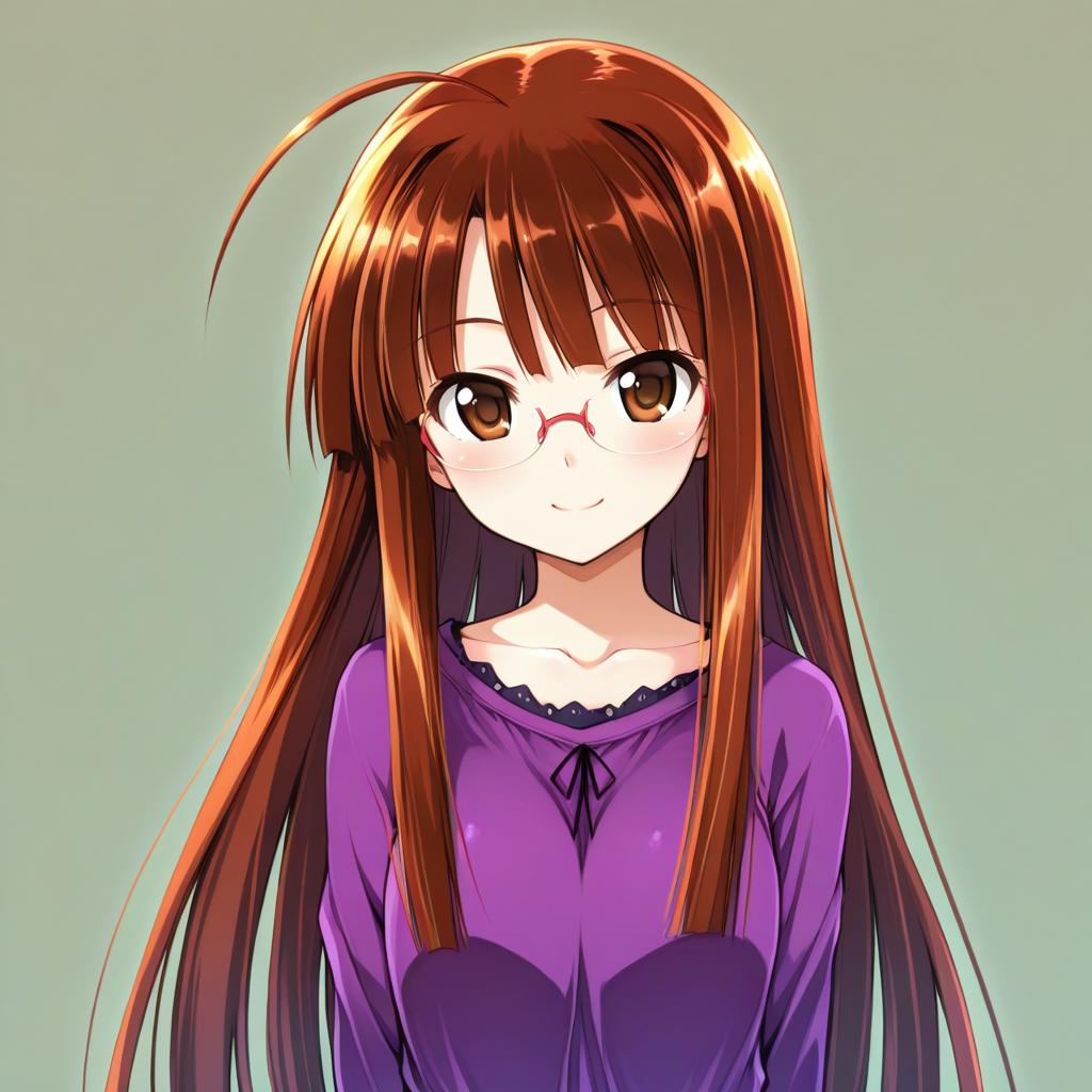 Digital illustration of an anime-style girl with long brown hair and brown eyes, wearing round glasses. She has an ahoge hair strand and is dressed in a purple top with a black lace collar. The background is a solid muted greenish color. The artwork is inspired by the character style from Mahou Sensei Negima.