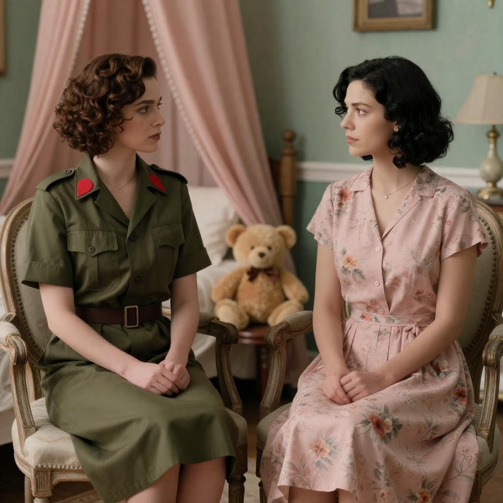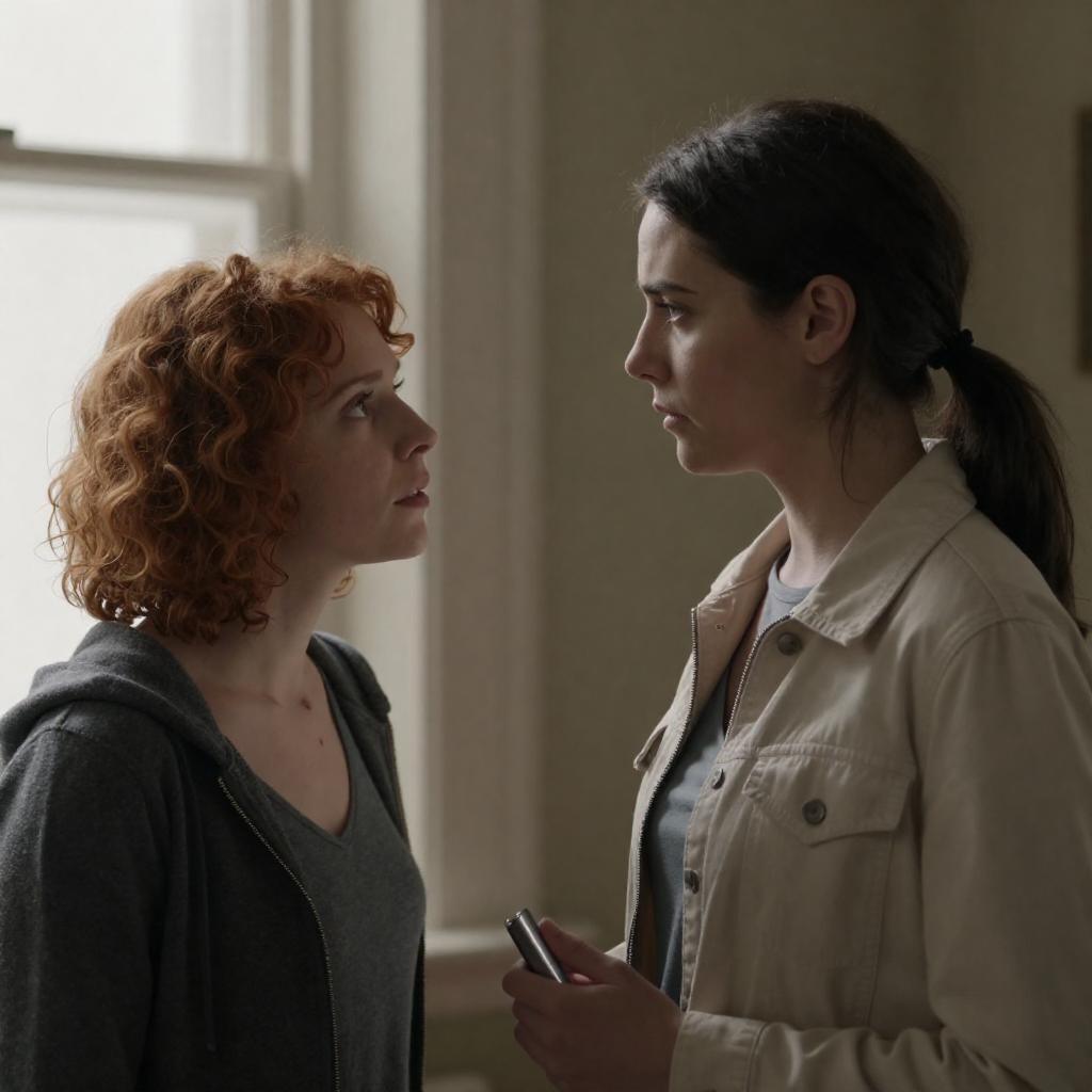 Woman with short, wavy brown hair in a dark green coat, side profile, serious expression. Background: blurred old building with wooden chair and dark window. Dim, muted colors. Movie still.