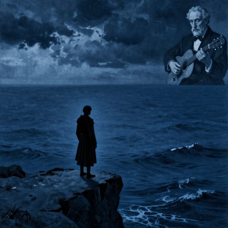 Digital painting in a surreal style depicting a lone figure standing on a rocky outcrop in the foreground, facing a vast, dark blue ocean. The figure, in silhouette, wears a long coat and stands with hands clasped behind their back. In the background, a large, ghostly image of an older man with white hair and a beard hovers above the water, playing an acoustic guitar. The sky is filled with dramatic, stormy clouds, adding to the eerie atmosphere. The overall color palette is dominated by various shades of blue, creating a moody and mysterious scene.