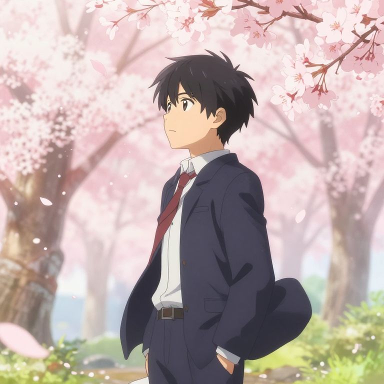Takenoko_no_you standing in a vibrant Japanese forest, surrounded by glowing bamboo and cherry blossoms, with a serene expression, soft morning sunlight filtering through the trees, detailed anime style, rich colors, dynamic lighting, 8k resolution.