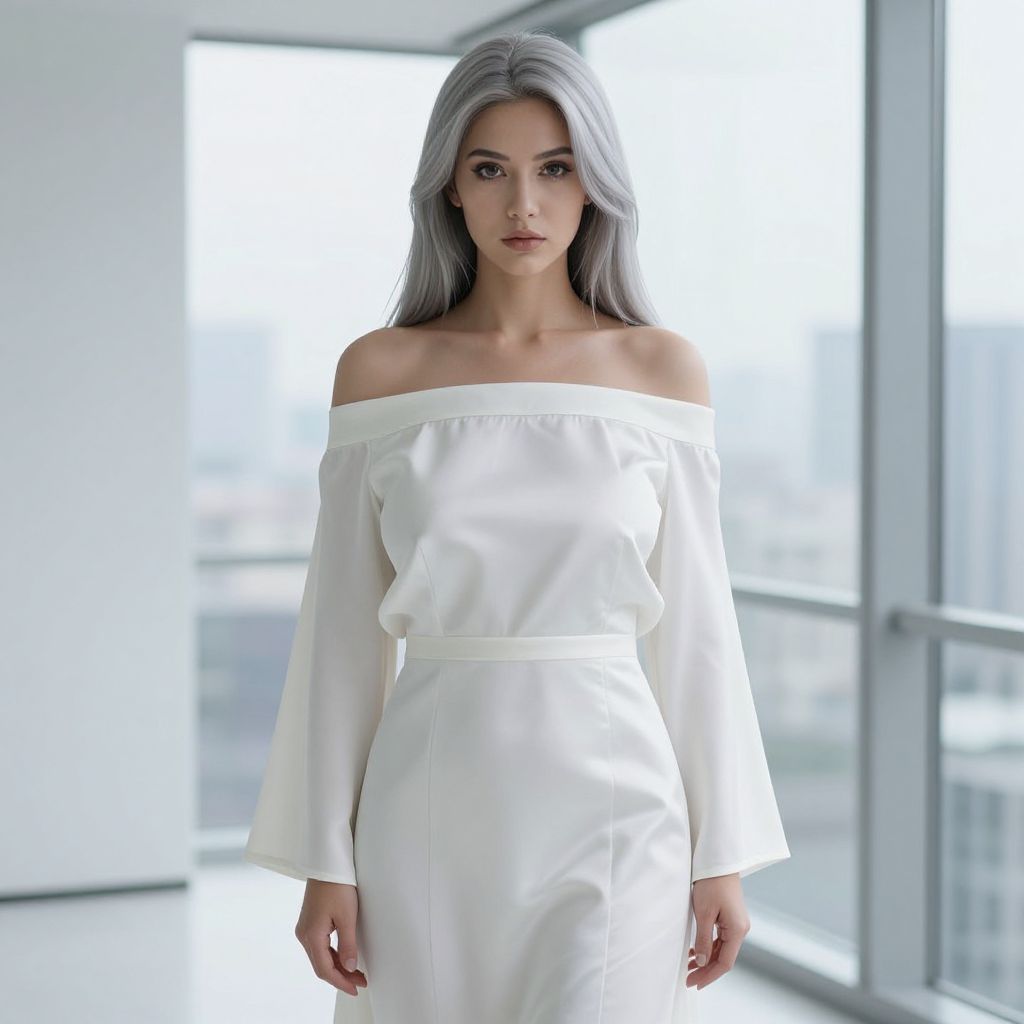 Photograph of a young woman with long, sleek, silver-gray hair standing in a modern, brightly lit room with large windows. She has light skin and a serious expression. She wears an off-shoulder, white, long-sleeve dress that fits snugly at the waist and flows down to her knees, emphasizing her slender frame. The dress is made of a smooth, slightly shiny fabric. The background shows a blurred, bright, outdoor scene through the windows, creating a contrast with her white outfit. The overall aesthetic is minimalistic and elegant.