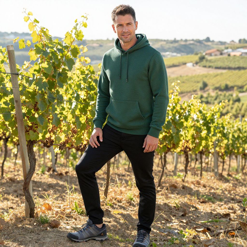 A man, fitted lightweight forest green hoodie, slim-fit black climbing pants, gray versatile trail runners, sun-drenched vineyards, ib technicolor film stock, relaxed smile, enjoying the moment. Man has masculine face and piercing eyes