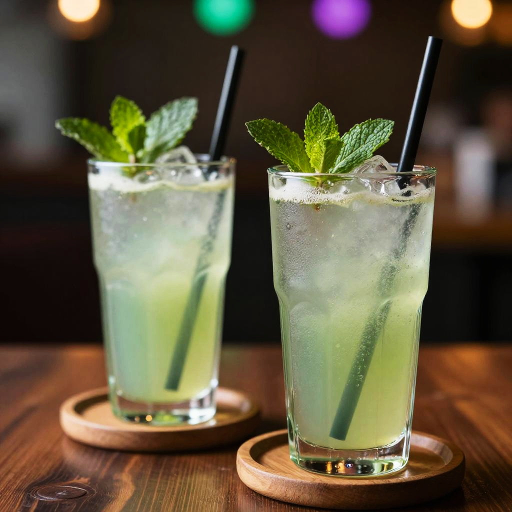 Photograph of three vibrant cocktails served in curvy glasses placed on a wooden table with visible grain. The cocktails are red with lemon slice and mint garnish, green garnished with fresh mint, and yellow with a lemon slice, each with a white straw. Sunlight casts warm shadows, highlighting the refreshing drinks.