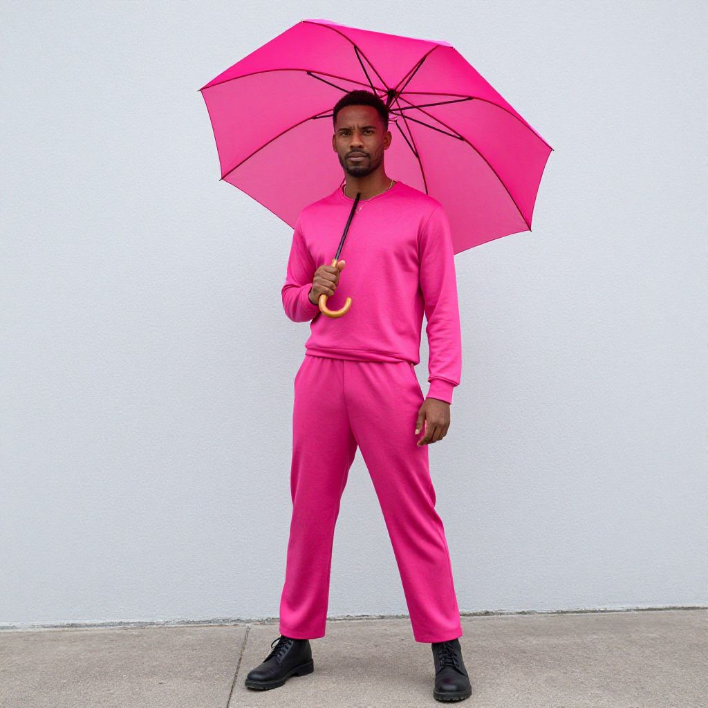 Magenta Costume Adult, dressed in pink standing in front of a wall with a large umbrella