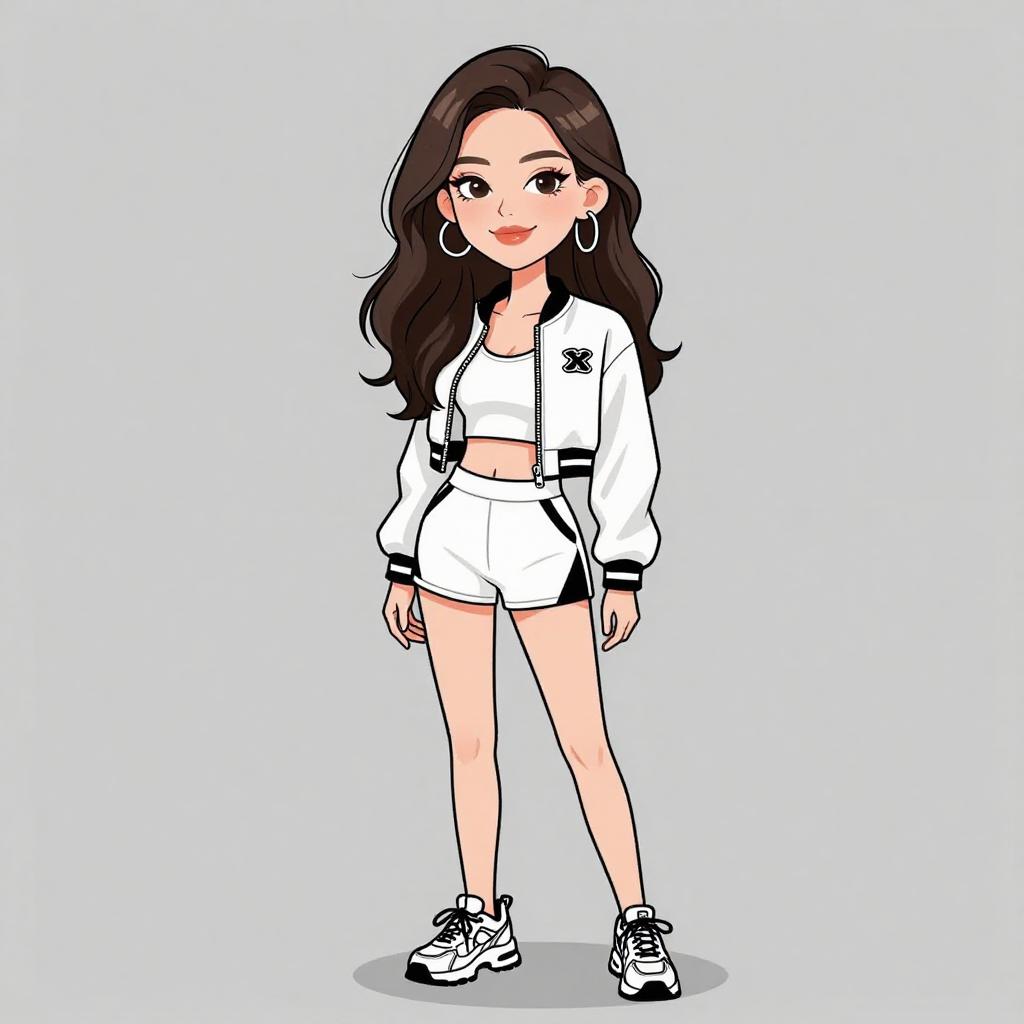 Woman with pretty face and pretty hair. smiling Woman, sporty chic, white cropped jacket with black accents and logo, matching high-waisted shorts with black triangular design, white crop top, chunky white sneakers, photo studio background --sref 1467