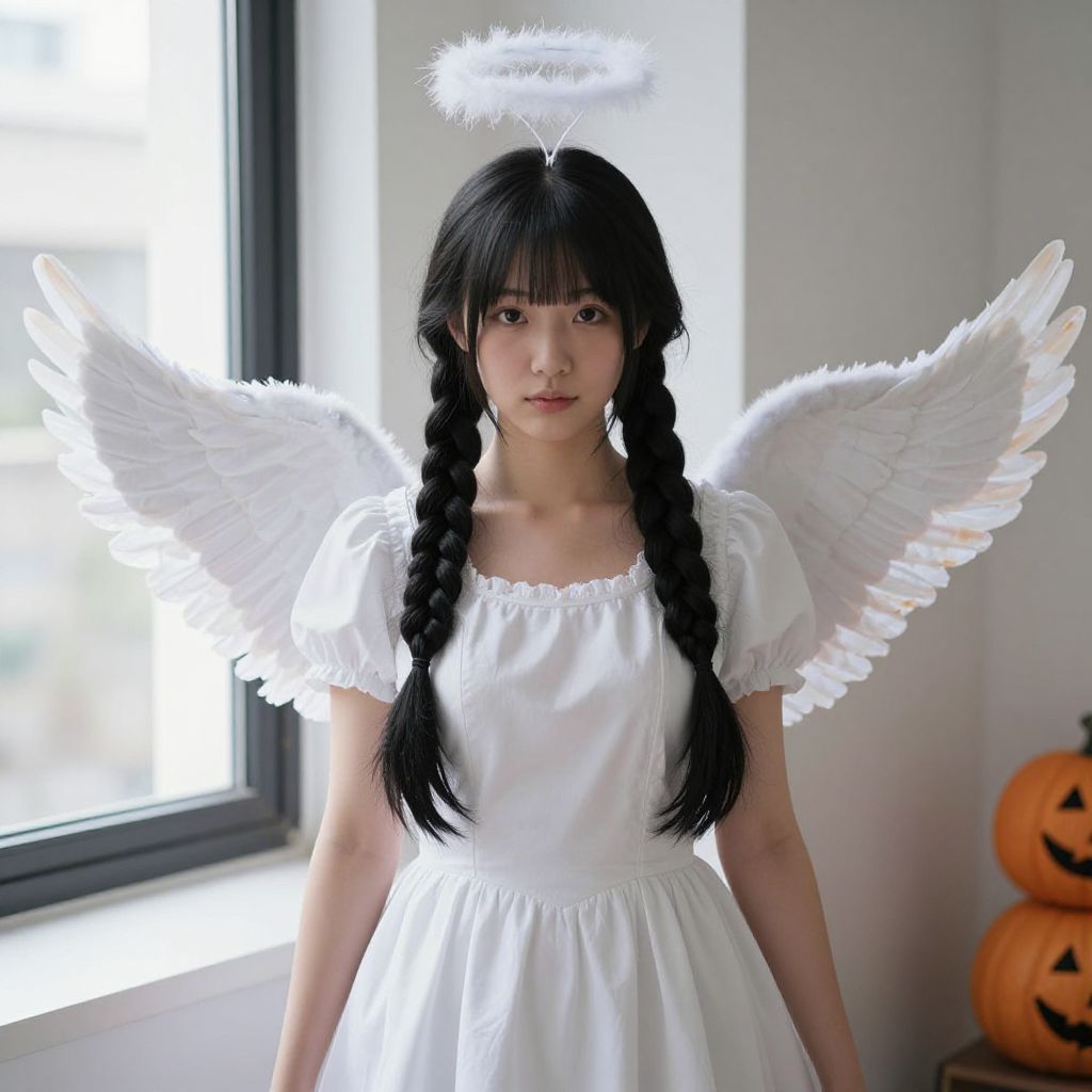Photograph of an Asian woman in a white, short-sleeved, satin angel dress with a puffed skirt. She has long, straight black hair in two braids, and wears white feathery angel wings and a glowing halo. Her expression is neutral. The background includes a bright window on the left and a carved pumpkin on the right. The lighting is natural, highlighting her smooth, fair skin and the soft texture of her dress. The overall style is cute and innocent, evoking a Halloween or angelic theme.