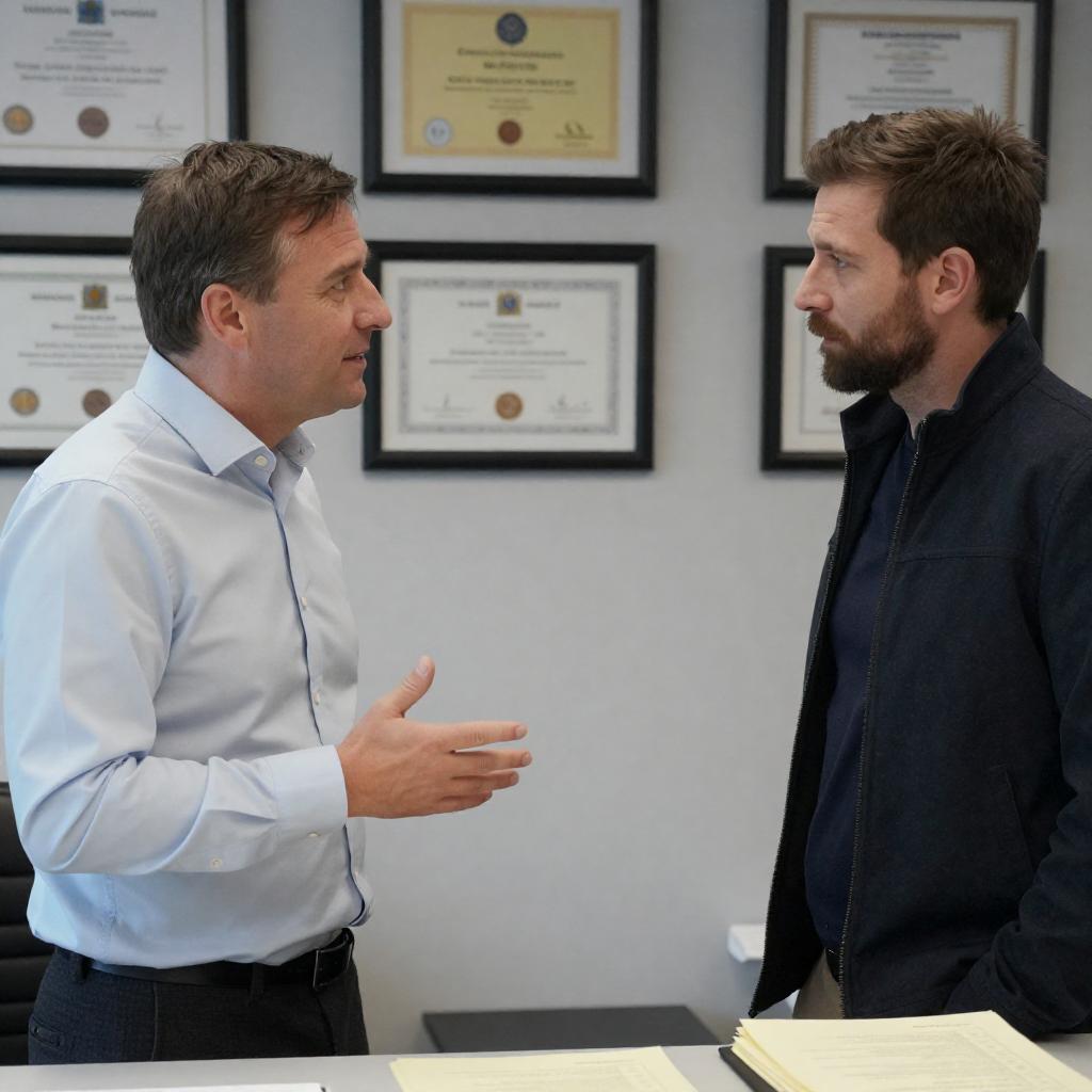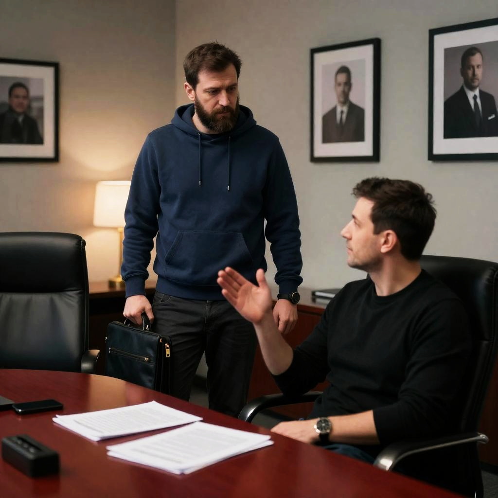 Photograph of two men in an office. Bearded man with beard stands, holding briefcase, wearing blue hoodie. Seated man in black shirt gestures with right hand. Dark leather chairs, red table, lamp, papers, and framed pictures on wall. Dim lighting.