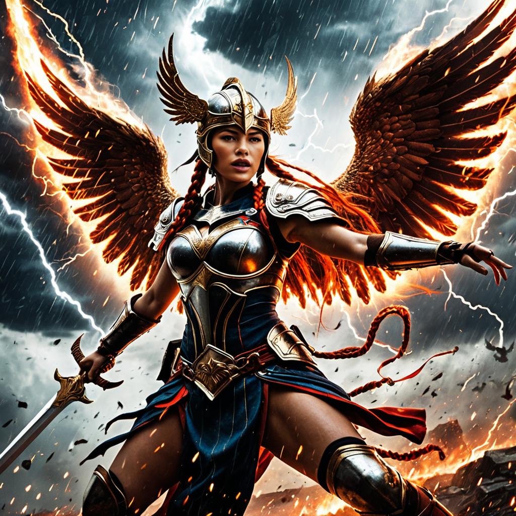 Fantasy art of a fierce female angelic huntress wearing white feathered armor with gold accents and a golden halo. She has large white wings and holds a sword and dagger in an agile pose, set against a dramatic celestial sky with streaming clouds, emphasizing stealth and dynamic motion.