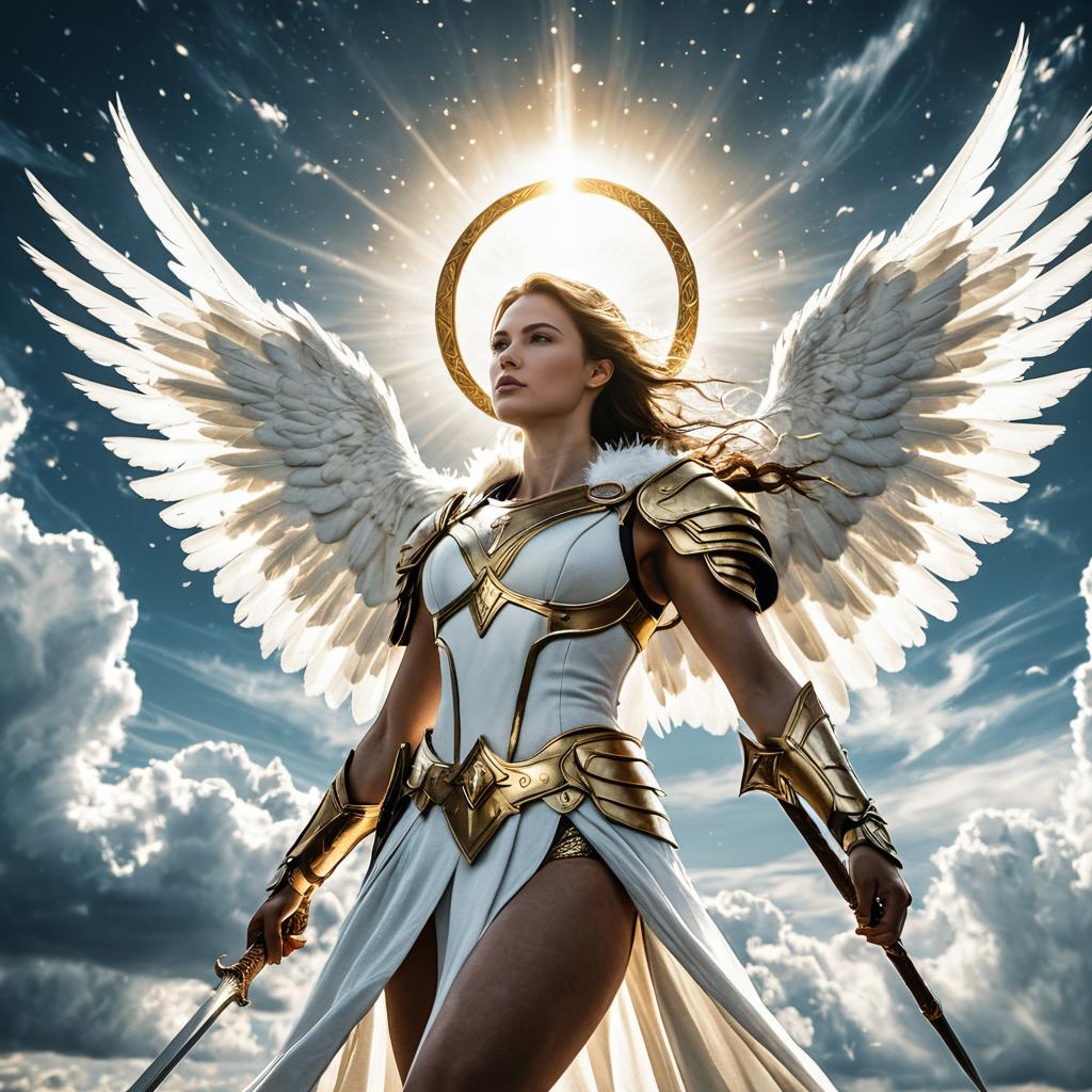Fantasy character art of a female Angelic huntress, with golden halo, white feathered armor. Depicted in an agile pose with celestial sky with streaming clouds, emphasizing stealth and dynamic motion.