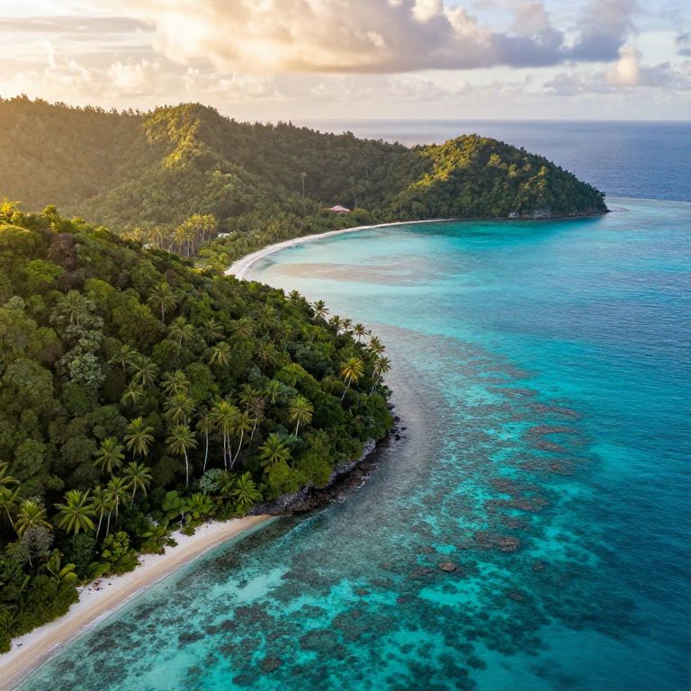 Aerial photograph of a tropical coastline at sunset. A curved, sandy beach with clear, turquoise waters transitions to deeper blue as it extends into the horizon. Dense, lush green forest with tall palm trees lines the beach, covering rolling hills. The sky is partly cloudy with warm, golden sunlight casting shadows on the landscape. The vibrant colors and natural beauty create a serene, idyllic scene.