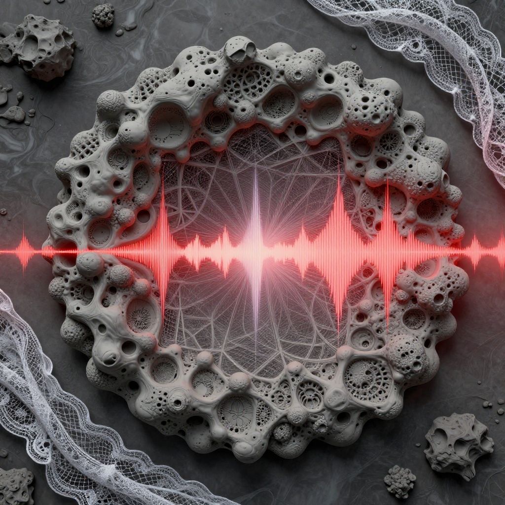 Digital artwork depicting a gray, textured, circular object resembling a coral or sponge with numerous holes, surrounded by white lace patterns. At the center, a bright, glowing white and red ECG heartbeat line radiates outward, intersecting with intricate web-like lines. The background is dark gray with additional lace patterns in the upper left and right corners. The image combines organic textures with medical and digital elements, creating a striking, futuristic contrast.