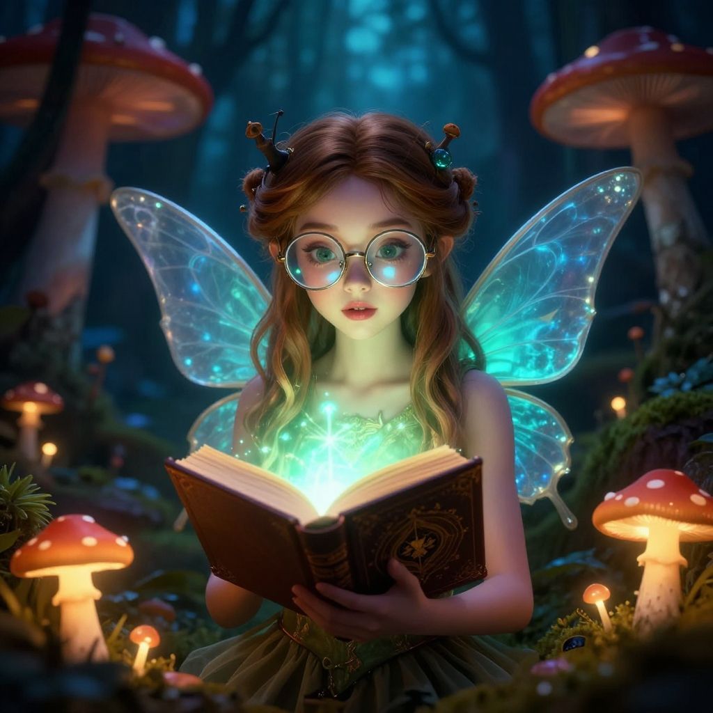 Nerdy fairy with oversized glasses, holding a glowing spellbook, surrounded by luminescent mushrooms in an enchanted forest, whimsical lighting, detailed fantasy style
