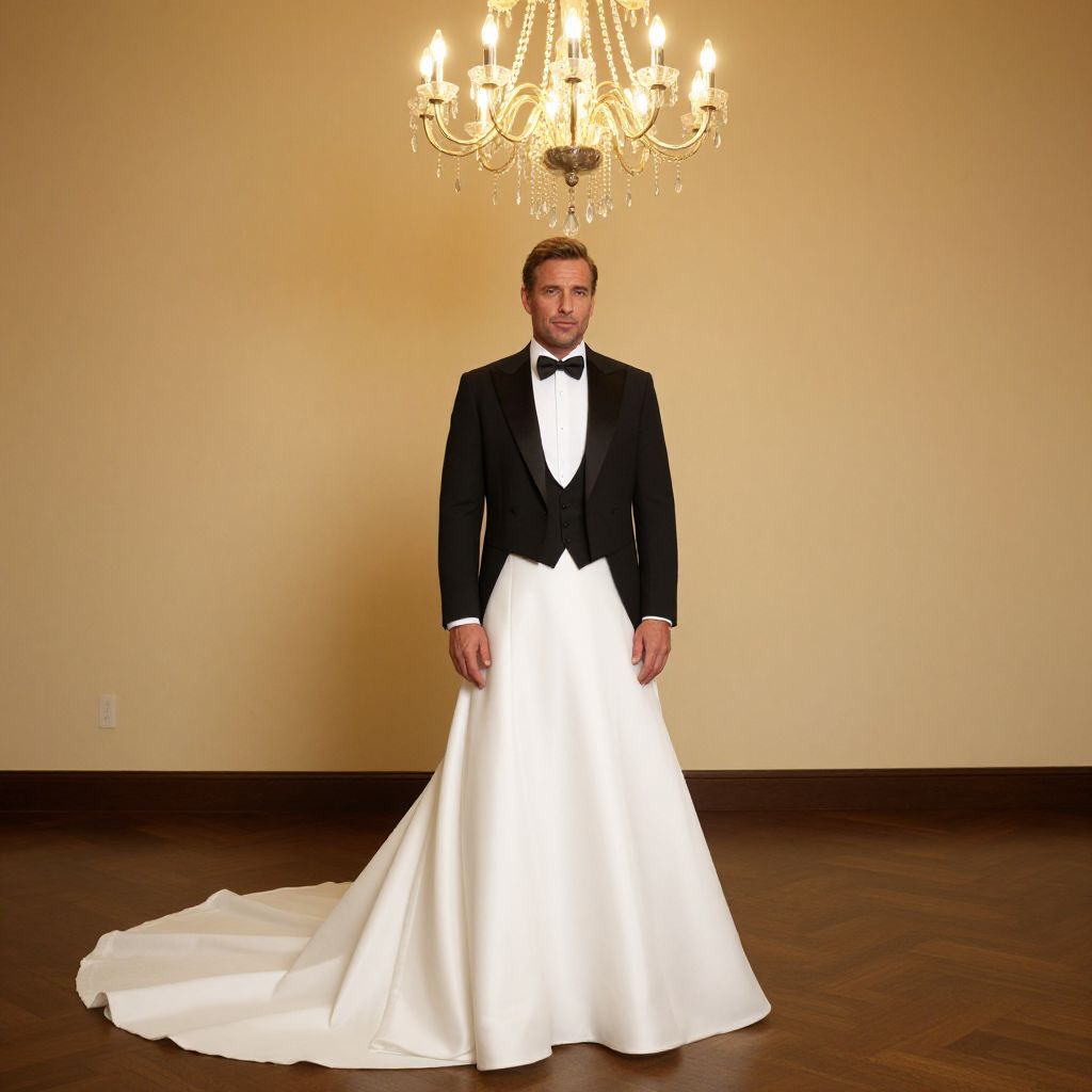 "Tuxedo Dress Wedding, man in a tuxedo standing in front of a wall with a chandelier"