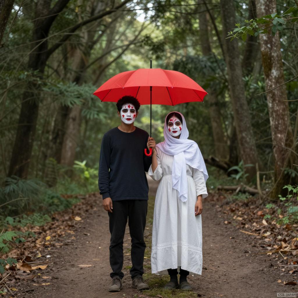 Two people in a forest, standing on a dirt path. One holds a bright red umbrella, the other wears a white dress and headscarf. Both have white face paint with red designs. Tall trees surround them, dense foliage fills background. Sunlight filters through leaves. Watermark "CSS-JAPAN" in bottom right.
