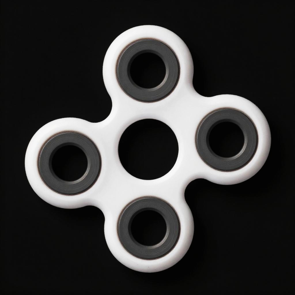 This is a digital image of a white, symmetrical, three-armed spiral design set against a solid black background. The shape resembles a fidget spinner or a triskelion, with a central black circular gap dividing the three arms. The stark contrast between the white and black makes the design stand out prominently. The image has a minimalist, geometric style.