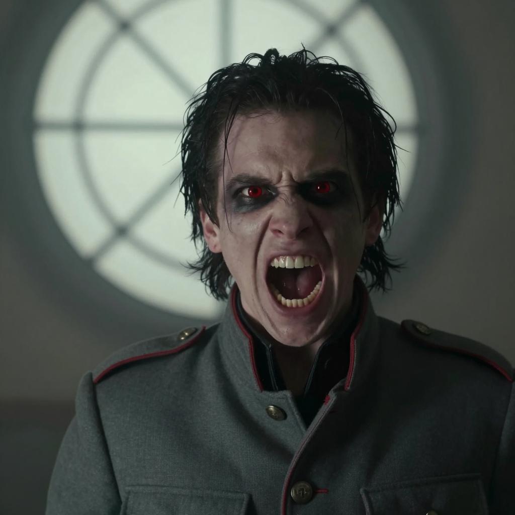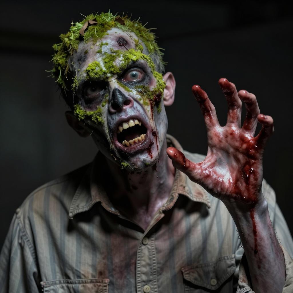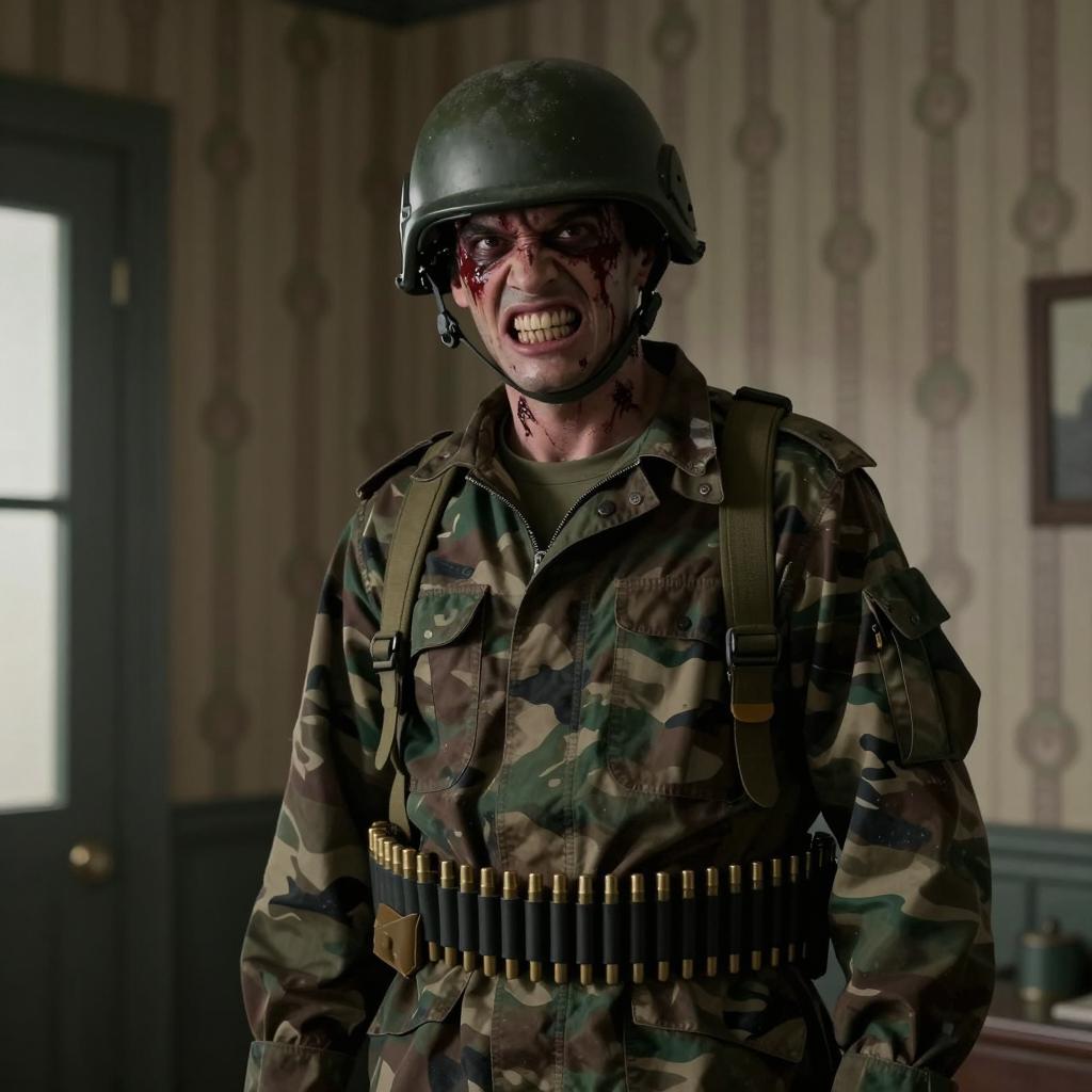 Zombie soldier in dark room, wearing green helmet, camouflage jacket, and ammunition belt with bullets, grimacing with bared teeth. Patterned wallpaper, beige and brown, in background. Doorframe on left, dark doorway, window on far left. Film still style.
