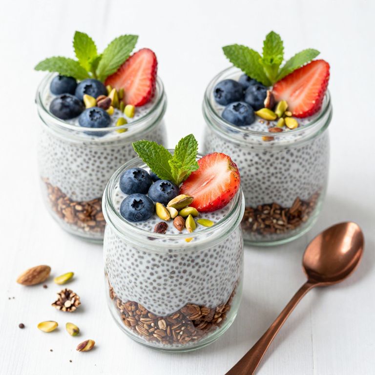Three glass jars filled with creamy coconut chia pudding layered with rich chocolate granola clusters, topped with fresh blueberries, sliced strawberries, whole pistachios, and a sprig of mint, accompanied by a copper spoon and scattered nuts on a pristine white surface.