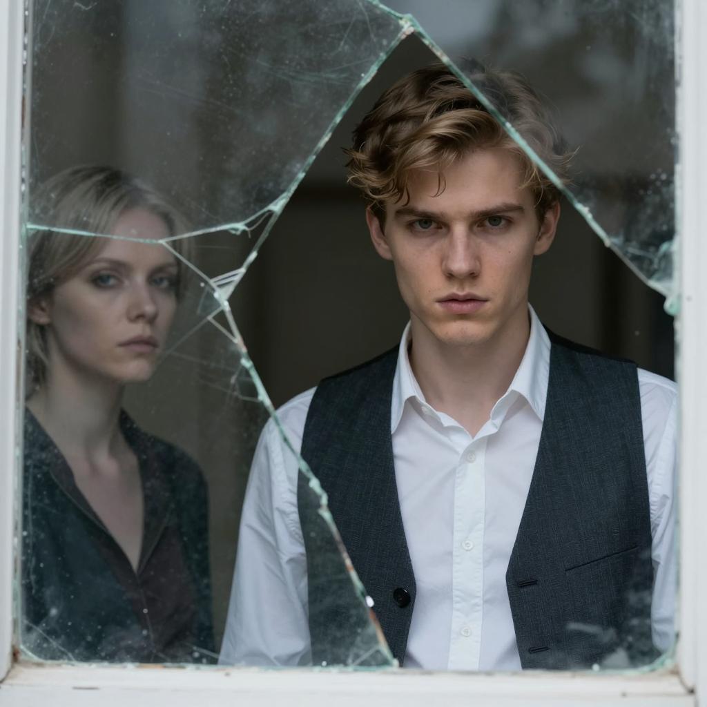 Photograph of two people through a broken window. Young man with light brown hair, white shirt, and dark vest, intense expression, looking forward. Woman with pale skin, short hair, and dark clothing, partially visible, looking to the left. Dimly lit background.