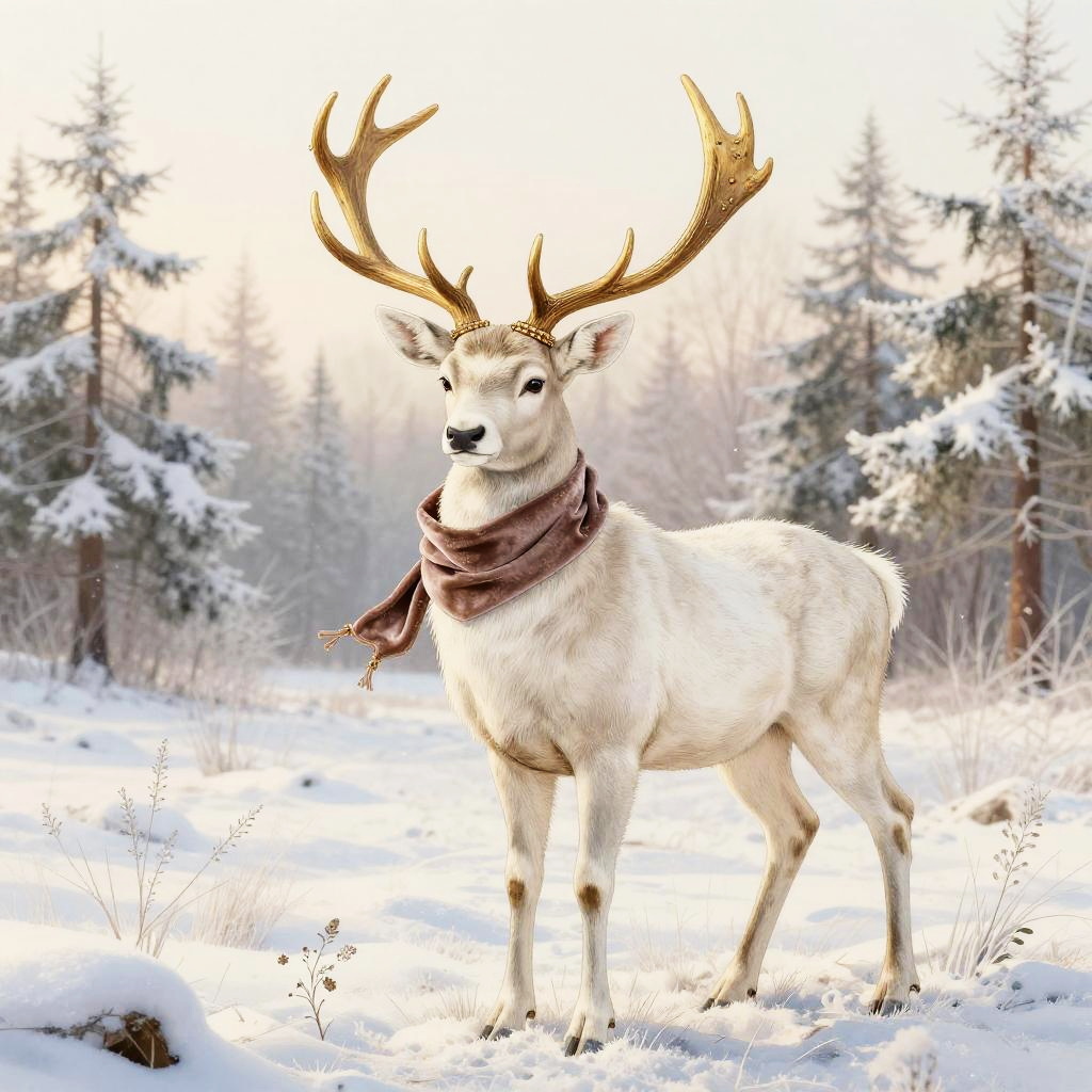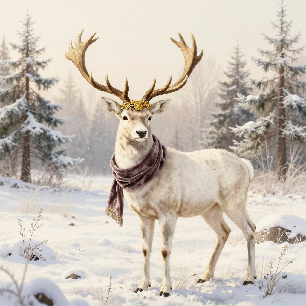 A serene white stag wearing an ornate gold antler circlet and velvet scarf, set in a snowy meadow bathed in early dawn light with frosted pines, vintage illustration aesthetic with delicate linework and fine crosshatching, muted warm palette on a soft cream backdrop, ornate botanical detailing, gentle and charming atmosphere, soft rim lighting, subtle paper grain texture, balanced and symmetrical composition, slight vignette, natural bokeh sparkle, ultra clean edges, high fidelity details
