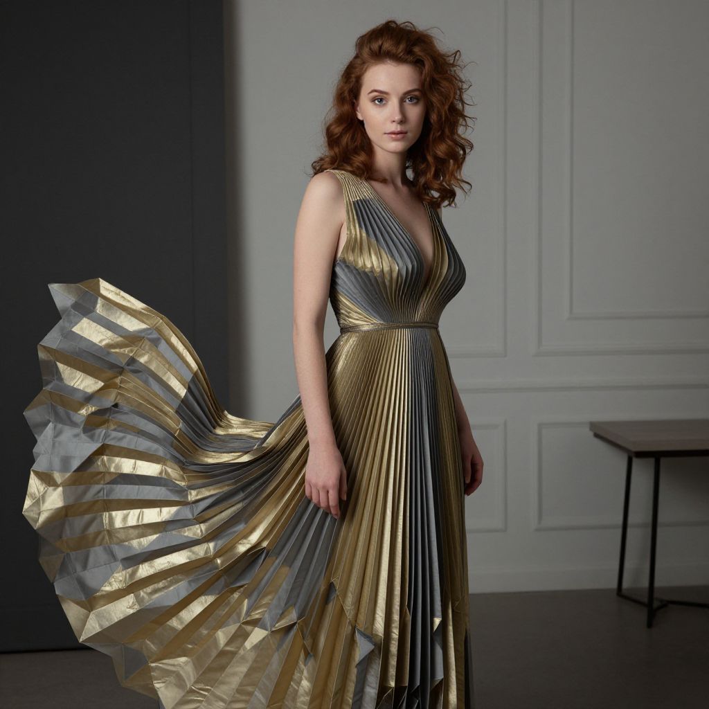 A serene woman with curly auburn hair and gentle blue eyes posing in a modern Scandinavian studio, dressed in a flowing pleated origami dress with intricate geometric folded patterns in gold and gray, the structure appears almost living, bending slightly under the soft ambient lighting, hyperrealistic fashion photography. The woman has big tits and cute face