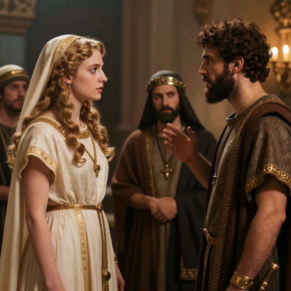 Photograph of a dramatic scene featuring a blonde woman with curly hair in a white, gold-trimmed ancient Roman-style dress and veil, facing a bearded man with curly brown hair in a brown, gold-trimmed tunic. The man gestures with his right hand while the woman looks at him intently. In the blurred background, two men in similar ancient Roman attire, one with a golden headband, stand observing. The setting is dimly lit, with warm, golden lighting and ornate, classical architectural elements. The image has a historical, epic film atmosphere.