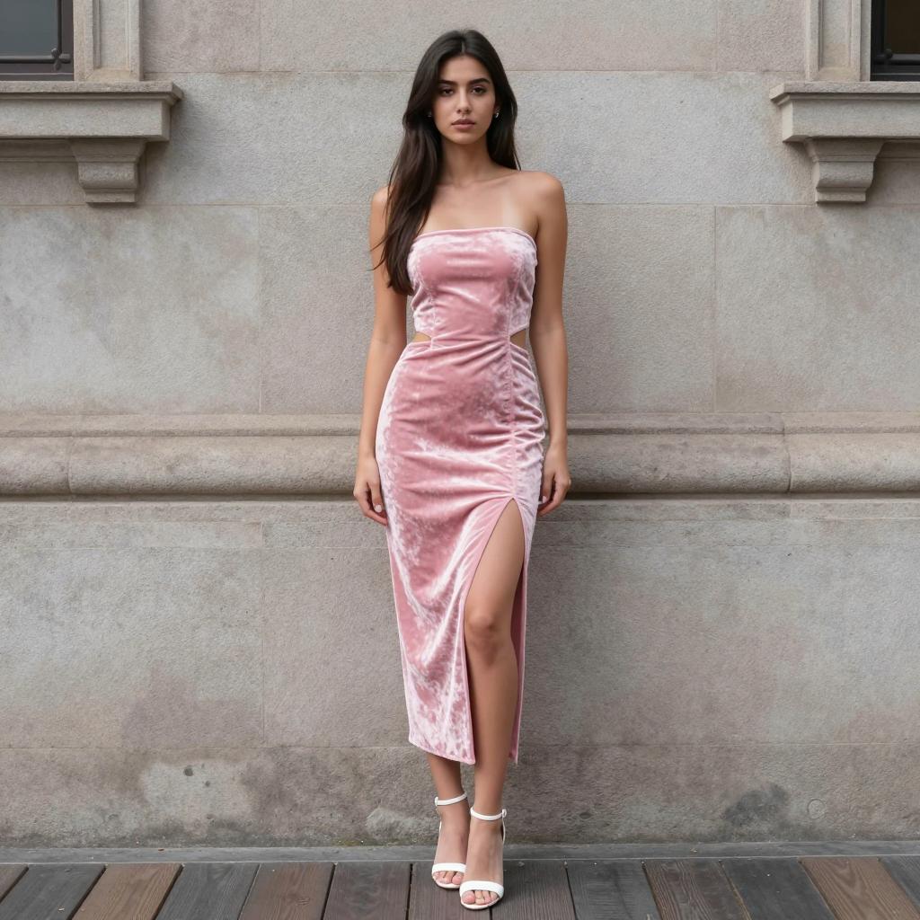 Young woman standing against a stone wall. Wearing a pink, strapless, velvet dress with cutout sides and a high slit. Long, dark brown hair, straight. White high-heeled sandals. Neutral facial expression. Gray stone background. Wooden pavement below. Full-length view. No additional people or objects.