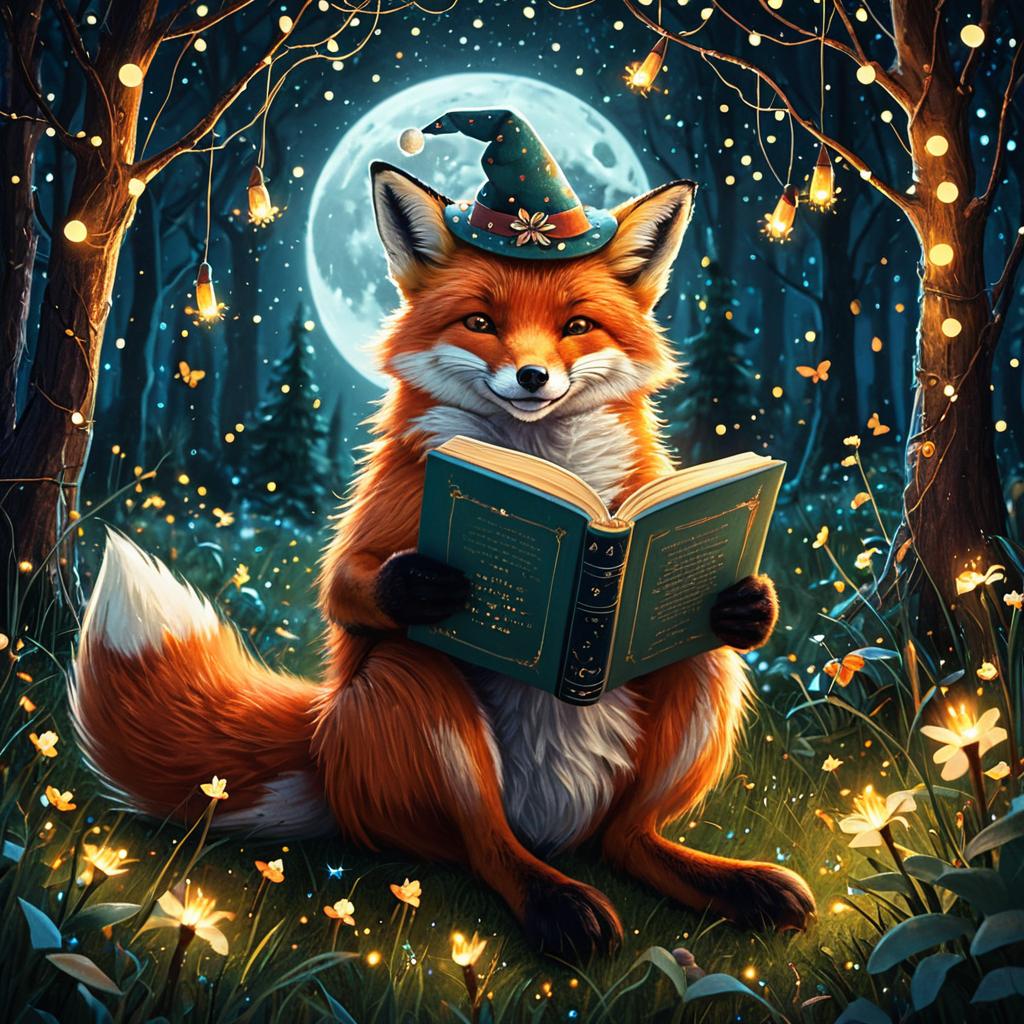 A cheerful red fox wearing a tiny hat and reading a book in a moonlit glade surrounded by twinkling fairy lights, rendered in vibrant fantasy digital art with glowing fireflies and a gentle warm color palette.