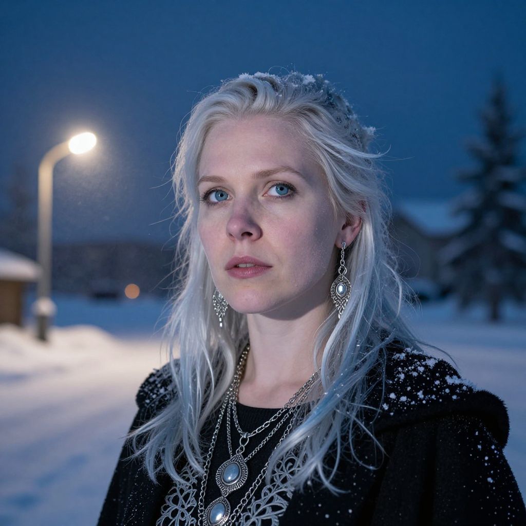 A Nordic woman with icy blue eyes and platinum hair, adorned with intricate silver jewelry, stands against a Scandinavian winter night backdrop. Captured from an unusual low angle, her face glows softly in the light of a distant streetlamp, casting subtle shadows that enhance her ethereal beauty. Stoic amidst the snow-covered landscape, she evokes serenity and mystery, inviting viewers to contemplate the untold stories behind this enigmatic figure.
