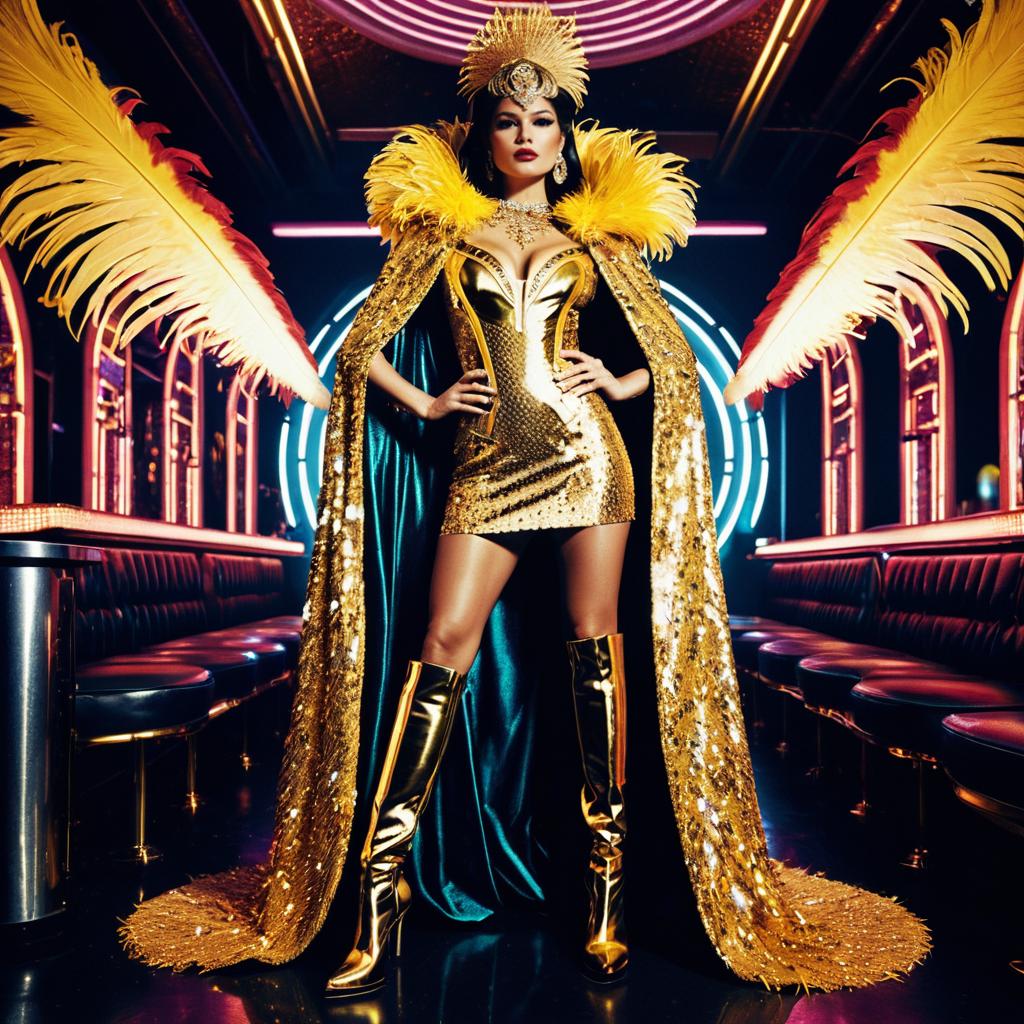 Full-body portrait of a woman in a high-fashion gold sequin mini dress and dramatic feather-adorned cape, wearing glossy gold knee-high boots and an ornate headpiece. Set in a retro-futuristic neon-lit nightclub with vivid, cinematic lighting and rich textures, captured with sharp focus in a glossy magazine editorial style.