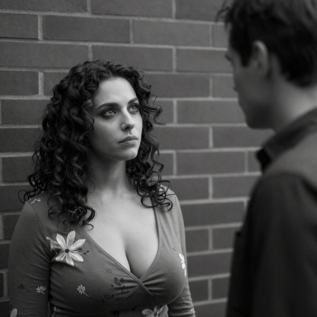 Black-and-white photo of a woman with curly hair and a floral-patterned top facing a man dressed in dark clothing, standing against a brick wall. The woman has an intense gaze, and the man is partially shadowed with a serious expression. The image captures emotional tension between the two figures.