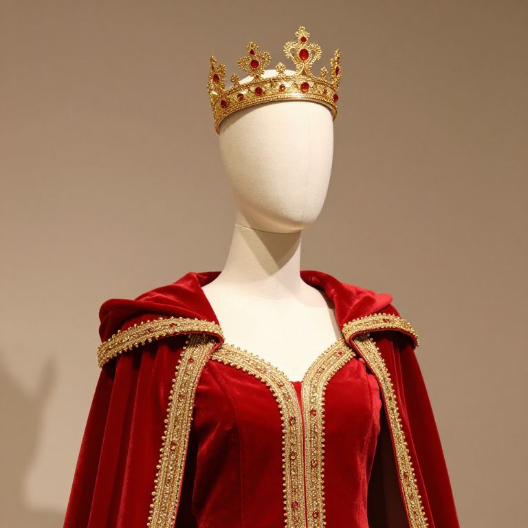 Mannequin wearing a red and gold outfit with a crown on its head.