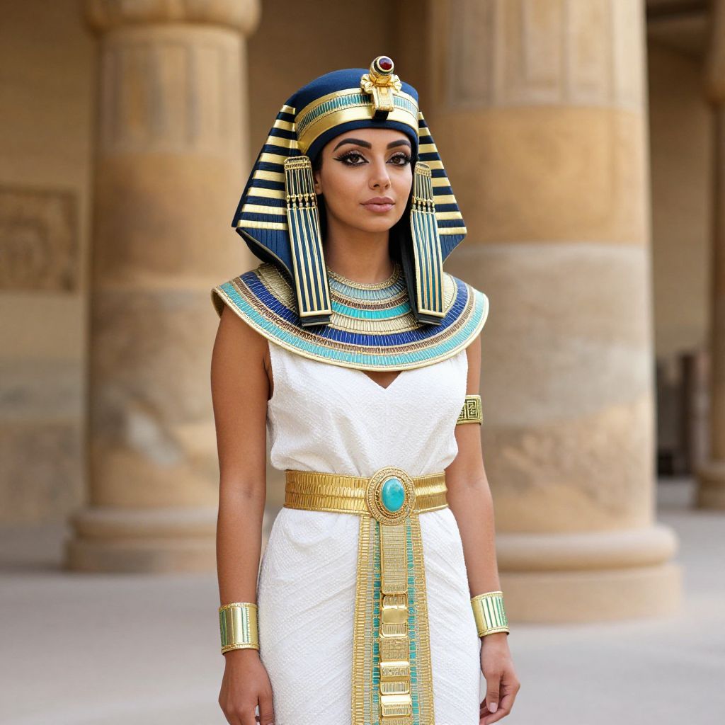 Photorealistic image of a young woman in an Egyptian pharaoh-inspired outfit, with striped blue and gold headdress, white dress, gold and turquoise