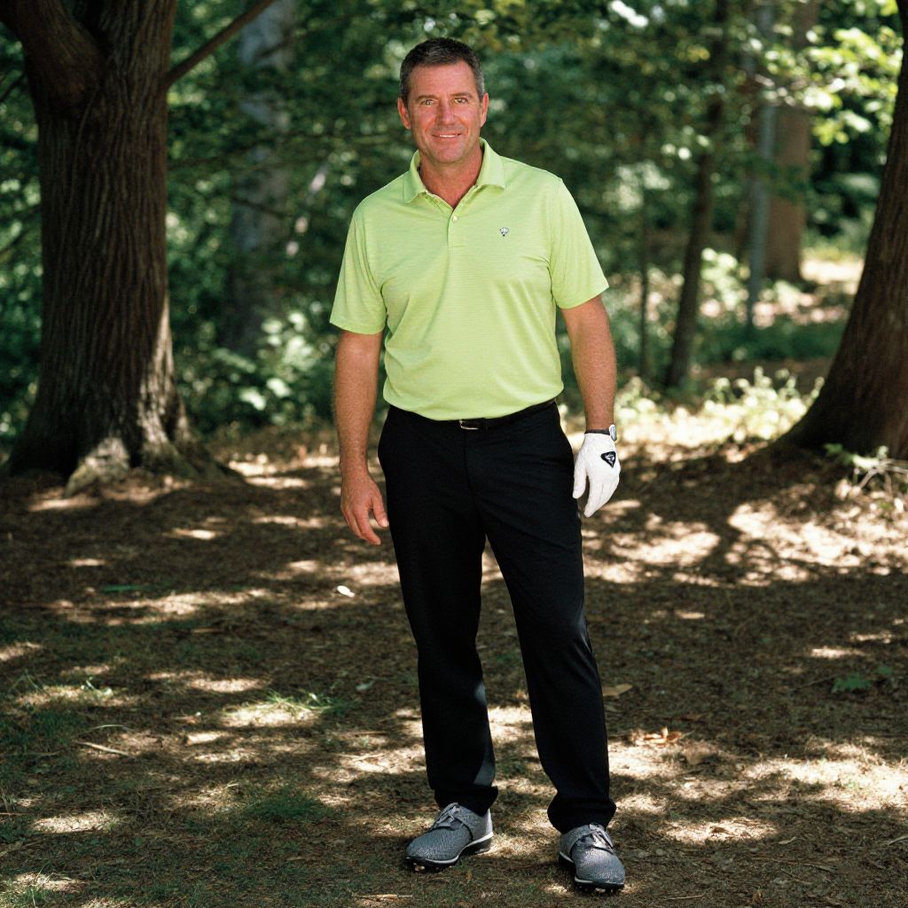 A man, bright green performance golf polo, black hybrid pants, gray mesh golf shoes, vibrant and energetic style, forest clearing, dappled sunlight, 3M ferrania analog film stock, confident smile, relaxed posture Man has masculine face and piercing eyes