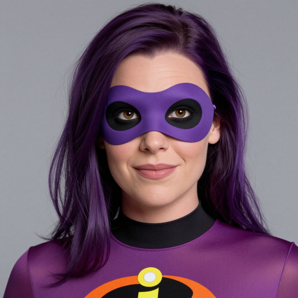 Violet Parr Incredibles Costume, a close up of a woman with a purple mask and purple hair