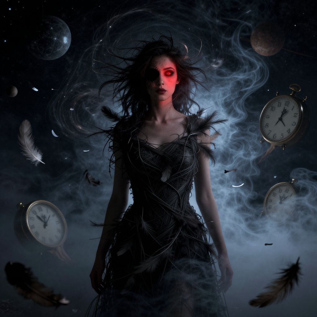 Visualize an enchanting digital art portrait that merges surrealism with elements of dark imagination. The central figure is a young woman with flawless skin, deep crimson lips, and inky-black hair elegantly styled in a bouffant reminiscent of the 1950s era. She dons a vintage blouse featuring intricate clock faces and delicate butterfly patterns, symbolizing both the fleeting nature of time and the enduring beauty that transcends it. The background showcases a dreamlike landscape where clocks dissolve into fluid forms, butterflies float gracefully, and a hazy terrain intertwines in an ethereal ballet, conjuring up feelings of intrigue, longing, and enchantment.