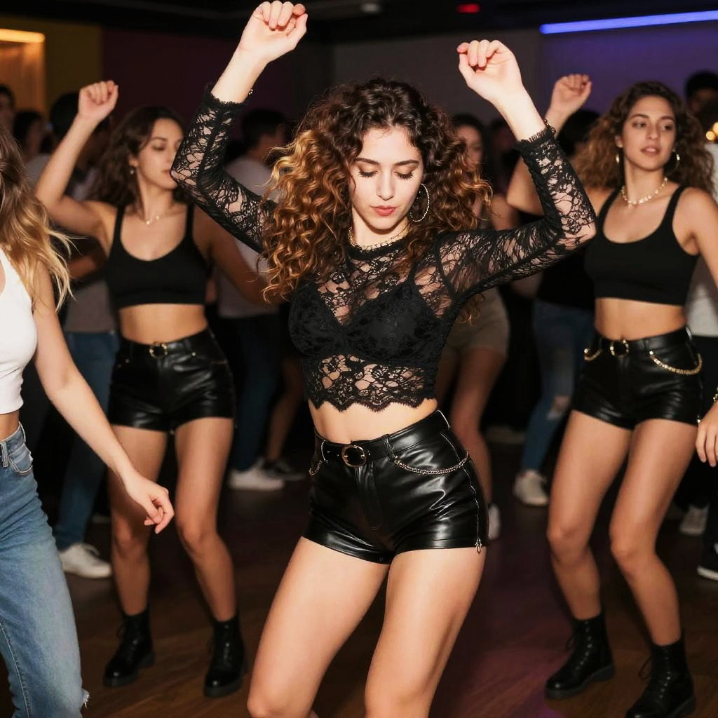 Slutty dance, energetic party environment with diverse group dancing, focus on daring outfit with lace and leather, motion blur to emphasize movement, vibrant and festive ambiance
