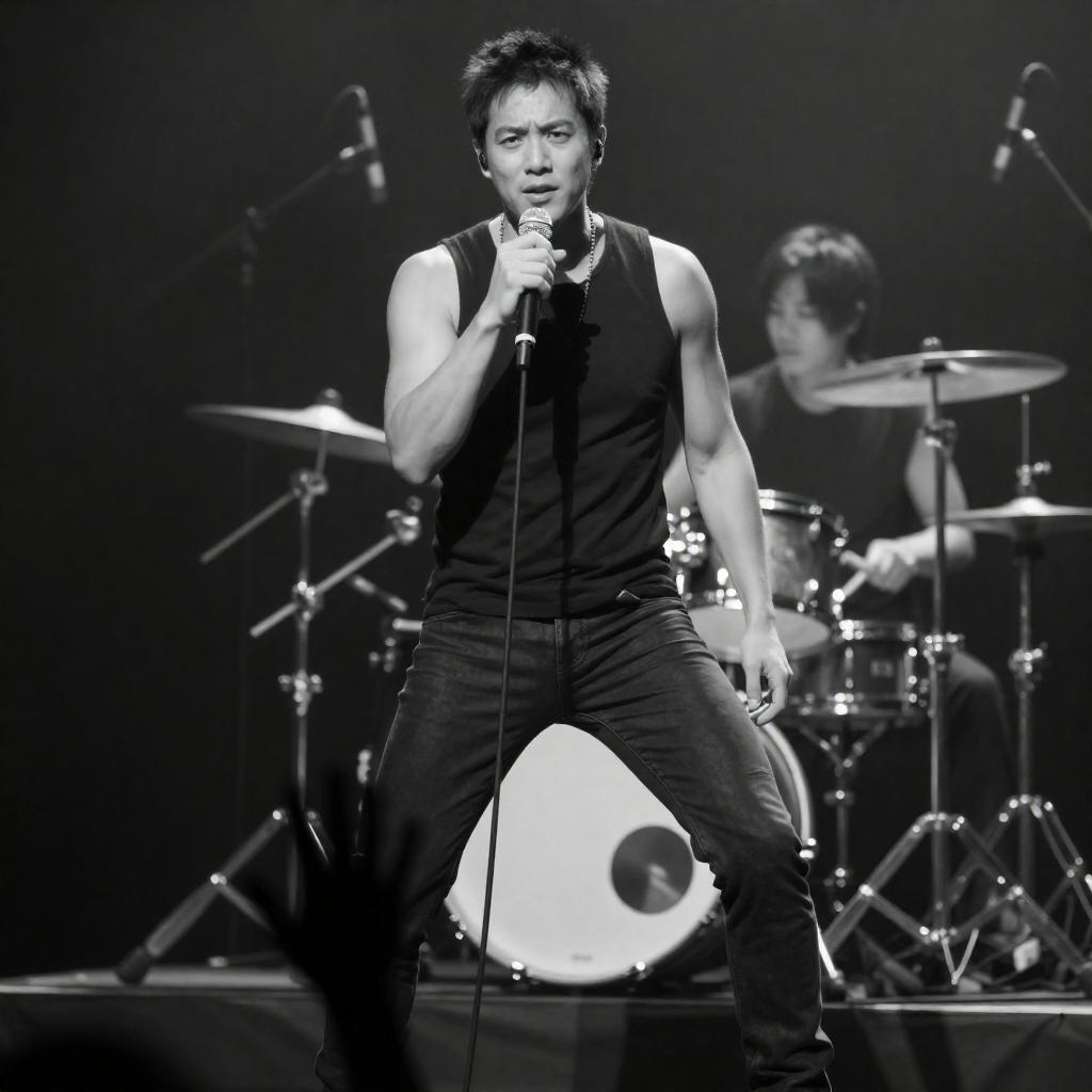 Black-and-white photograph of a muscular male rock singer with short, dark hair, wearing a sleeveless black shirt and dark pants, standing on a stage with a drum set in the background. He holds a microphone and stands with one leg slightly raised. A raised hand is visible in the foreground. The drummer is partially visible behind him.