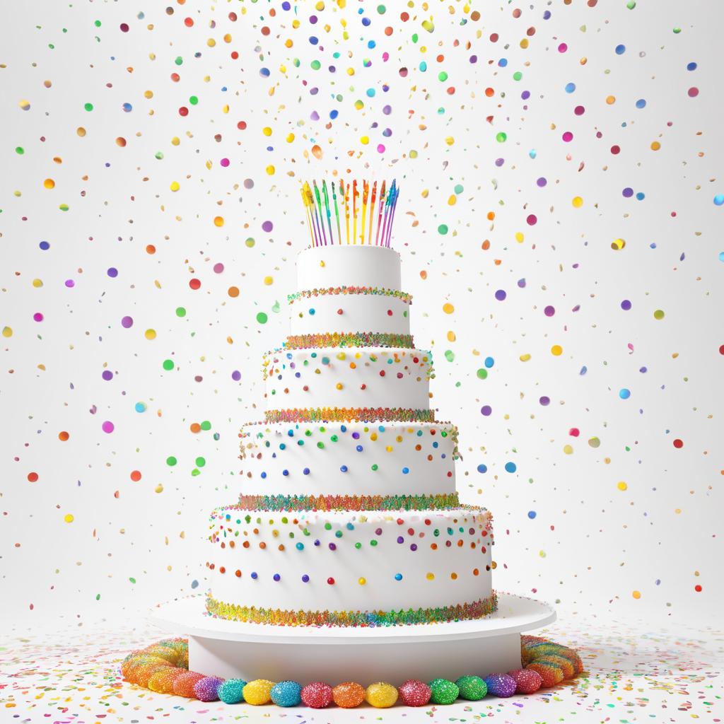 Four-tier white wedding cake adorned with vibrant rainbow-colored sprinkles and topped with rainbow candles. Colorful polka dot confetti and sprinkles rain down against a white background. The cake is displayed on a white round platform surrounded by multicolored sprinkle balls, captured with dramatic lighting from below.