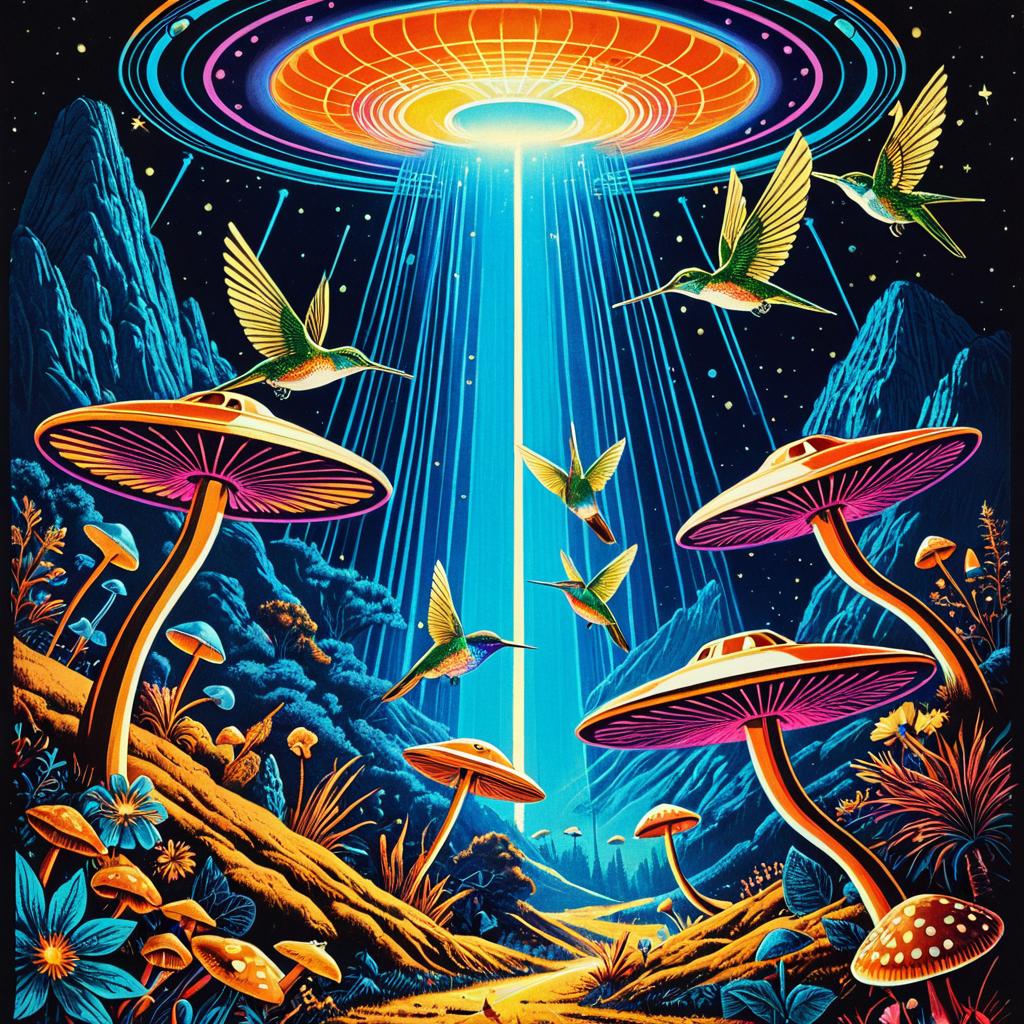 Vintage 70s black light poster of radiant hummingbirds, smoking joints, alien landscape, UFO flying saucers, psilocybin cubensis mushrooms, vibrant trippy colors, iridescent gold and sapphire, crystal refraction effects