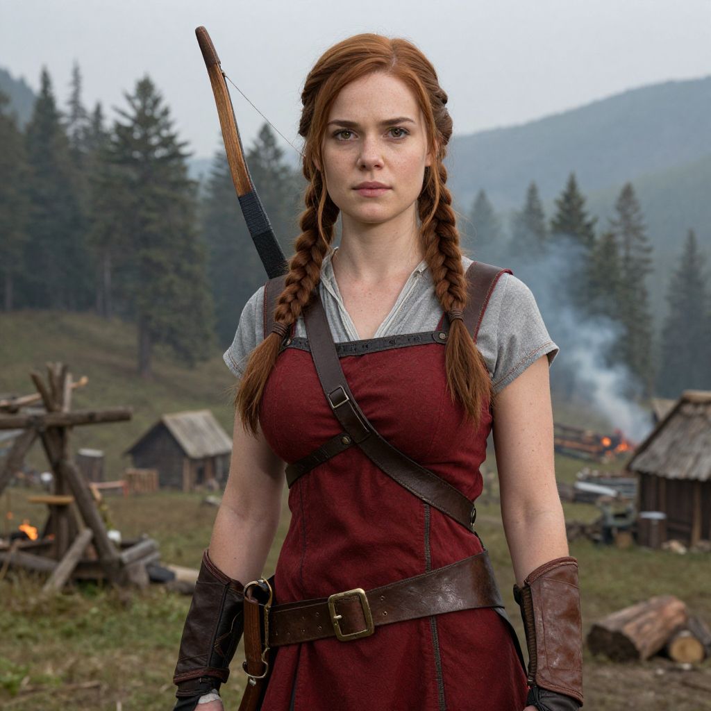 Photograph of a red-haired woman with braided hair, wearing a maroon dress and leather gloves, standing in a rustic, wooded village with log