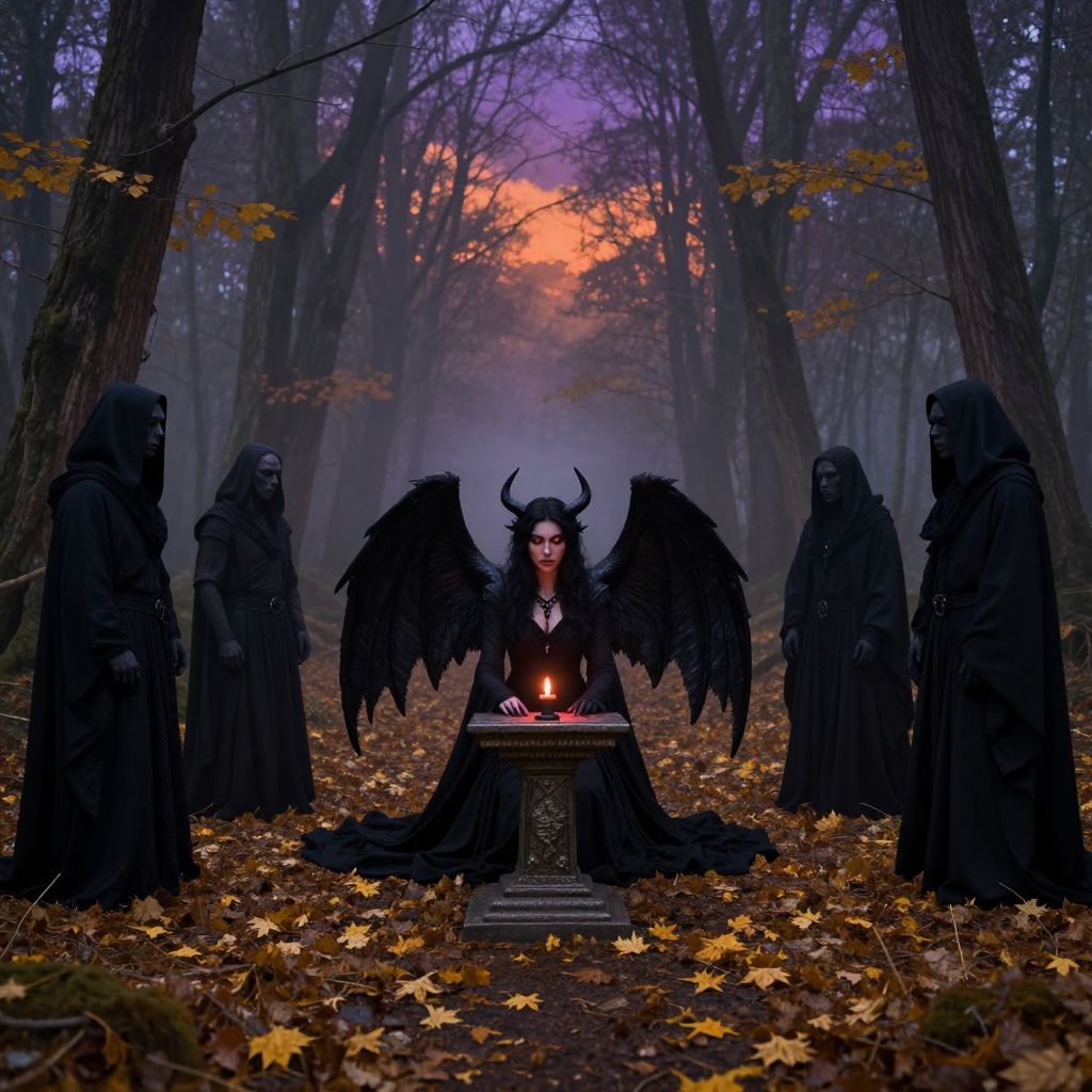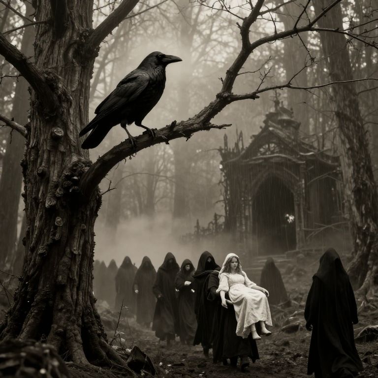 Hyper-realistic sepia-toned image of a large raven perched on a branch of a dead tree in an ancient English forest. Below, a procession of hooded cloaked cultists carries a white-clad young woman, representing a sacrificial victim, through the mist and drizzle towards a dark, eerie structure. The scene is filled with fog and dense trees, evoking a spooky, gothic atmosphere.