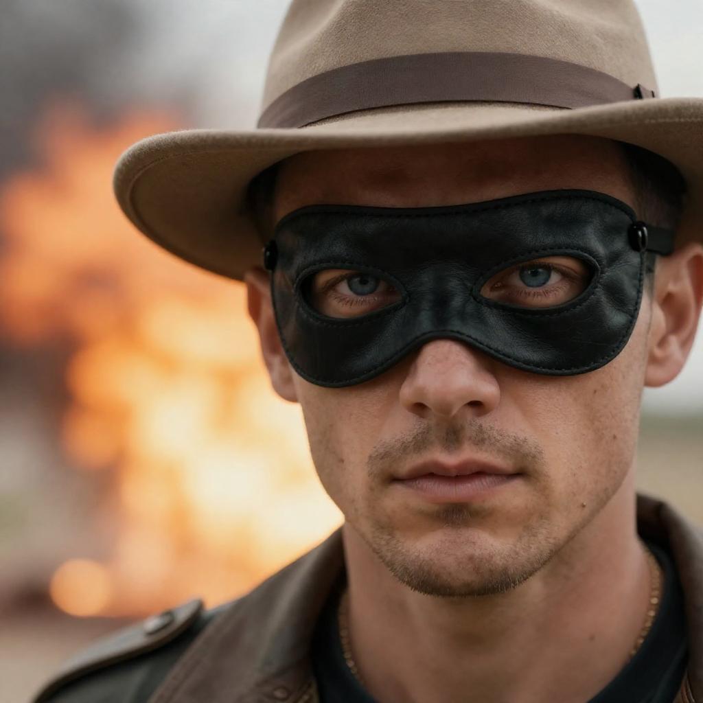 Close-up photograph of a man with a rugged face, wearing a black leather mask covering his eyes and part of his nose. He has blue eyes, stubble, and is wearing a beige hat. Background shows an explosion with orange and yellow flames. Man's expression is intense and focused.