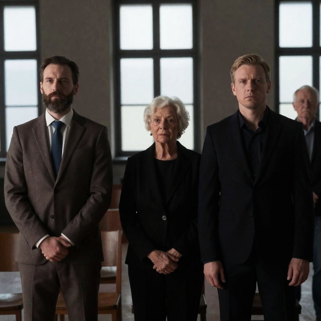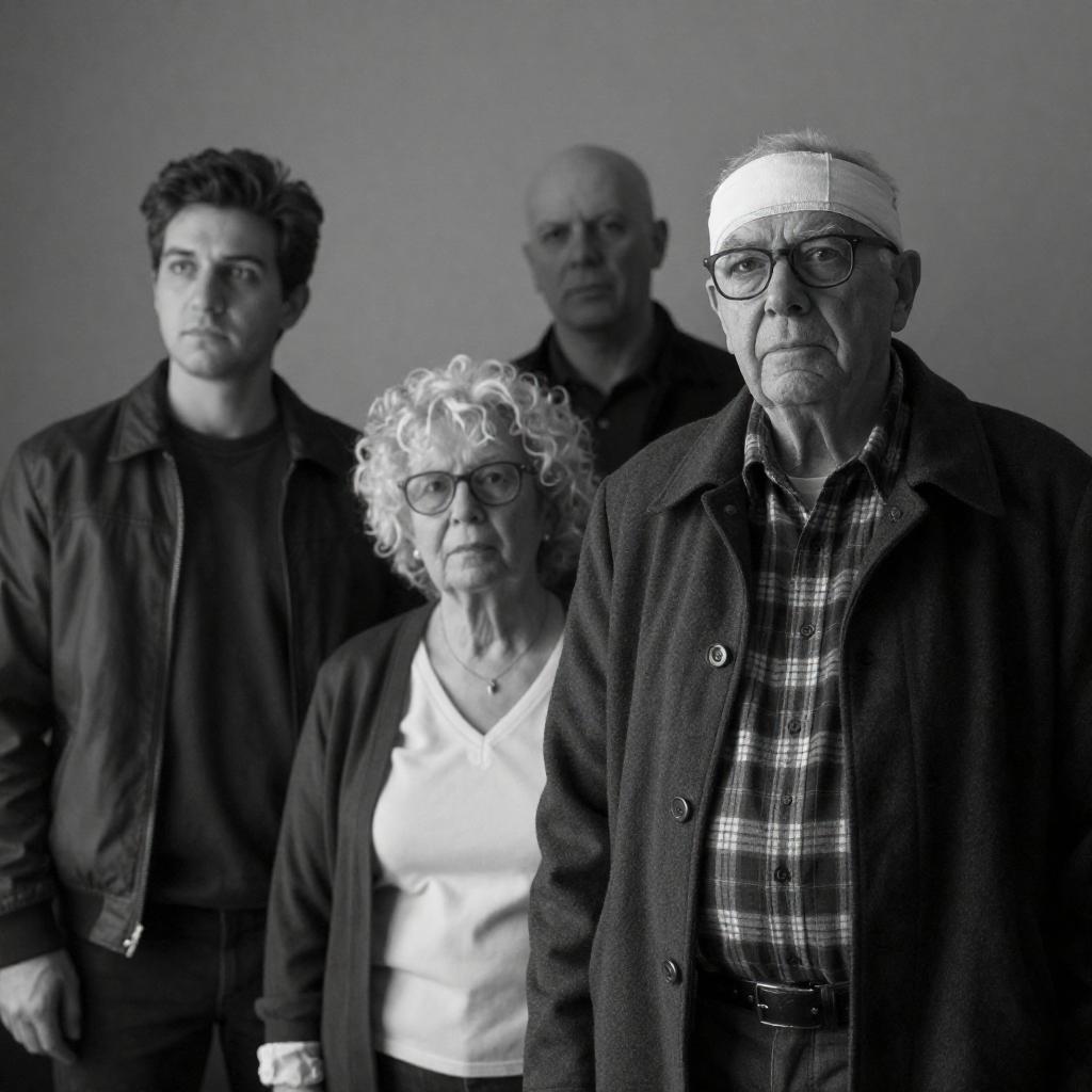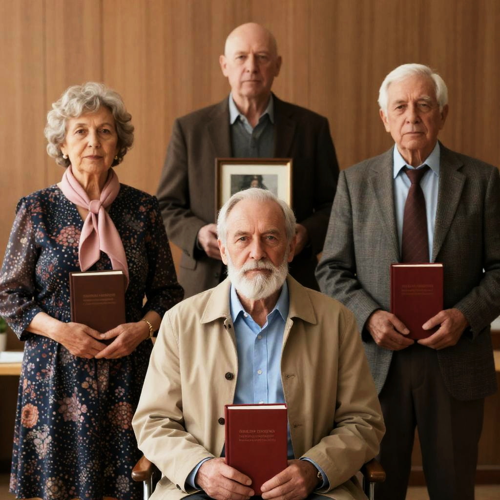 Photograph of five elderly people standing and sitting indoors. Front: bearded man in beige coat, blue shirt, holding red book. Left: woman in floral dress, pink scarf, holding brown book. Back: bald man holding framed picture, brown suit. Right: older man with white hair, plaid suit, holding red book. Wood-paneled background. All holding books or picture, focused expressions.