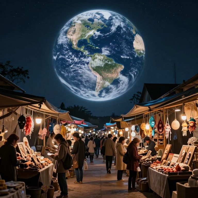 A bustling marketplace suspended upside-down beneath the Earth’s shadow, where merchants trade in dreams harvested from sleeping minds under moonlight.