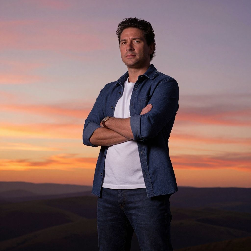 Photograph of a confident man with dark curly hair, wearing a denim shirt over a white t-shirt, standing with arms crossed against a vibrant sunset sky