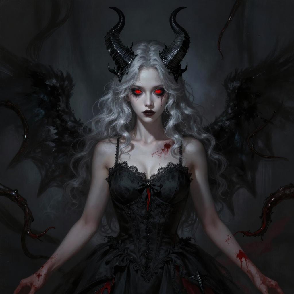 Digital painting of a pale-skinned, red-eyed female figure with wavy silver hair and a black, ornate horned headdress. She wears a black, lace-trimmed dress with blood stains on her chest and hands. Dark, shadowy tendrils surround her, creating a gothic, eerie atmosphere. Her expression is calm yet intense.