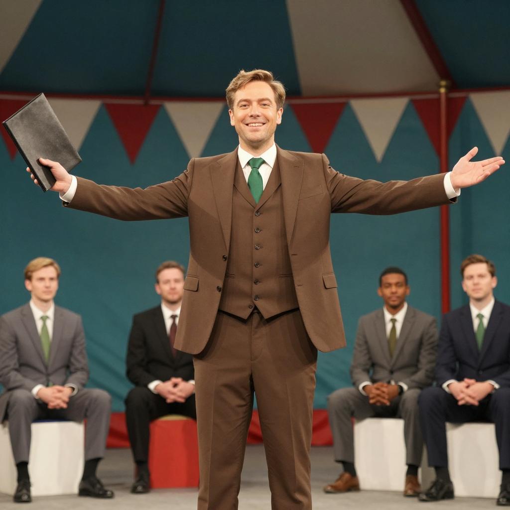 Man with light brown hair, medium build, smiling, wearing brown three-piece suit, green tie, white shirt, holding black folder, arms outstretched, standing in circus tent, four other men in suits sitting in background, striped bunting on wall, green tent walls.
