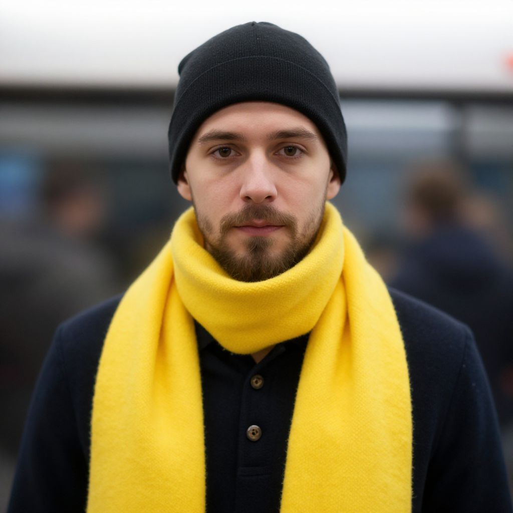 Photograph of a white man with fair skin and a short brown beard, wearing a black knit beanie, black buttoned coat, and bright yellow scarf. His expression is neutral, with slightly furrowed brows and direct gaze. The background is blurred, showing indistinct shapes and colors, suggesting an outdoor urban setting. The man's outfit contrasts sharply with the muted background, making the yellow scarf stand out prominently. The lighting is natural, with overcast sky suggested by the soft light. The overall mood is casual and slightly somber.